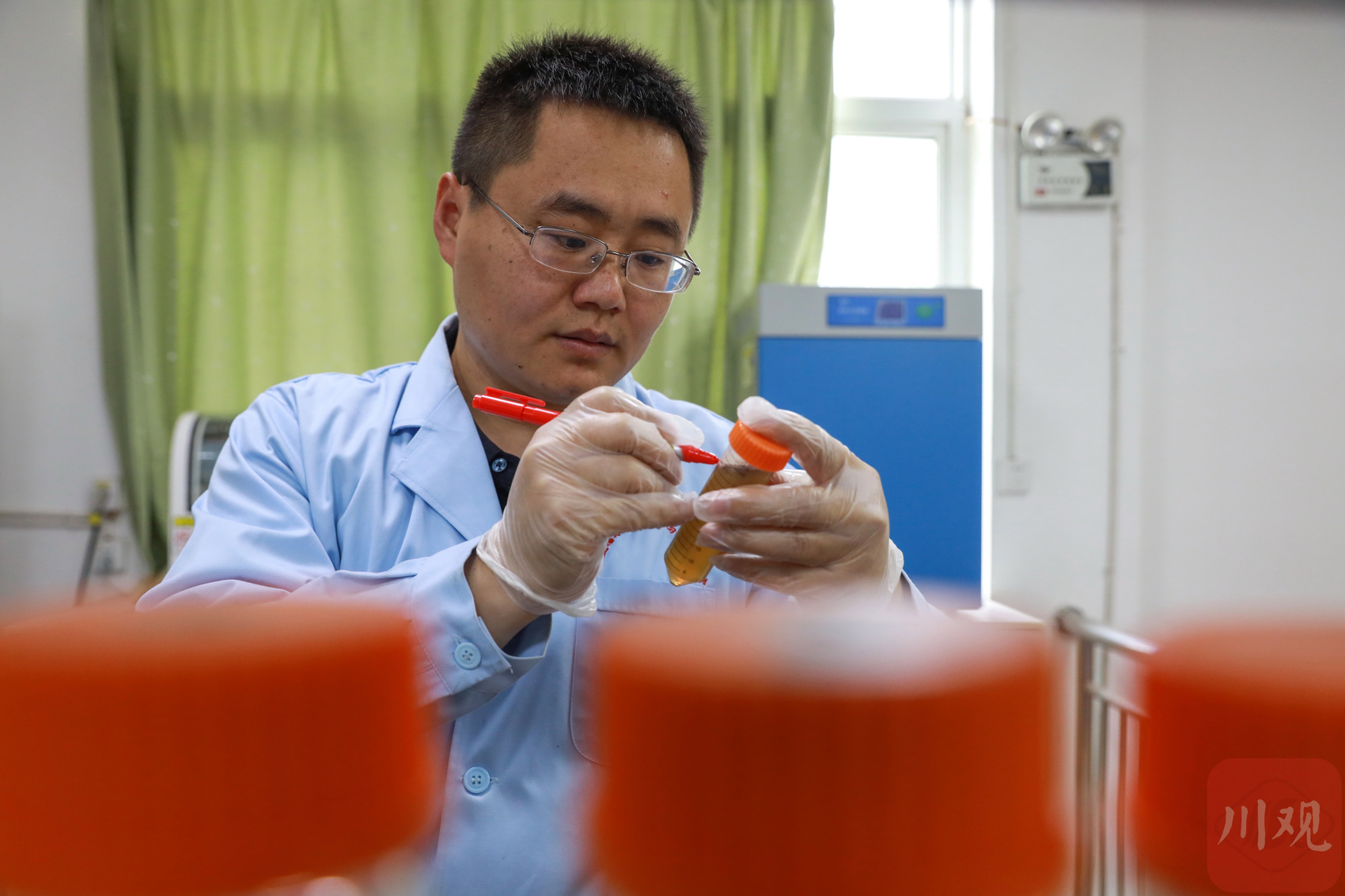大熊猫小种群保护与复壮研究开放实验室工作人员朱玉东正在进行大熊猫保护相关实验。