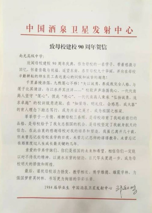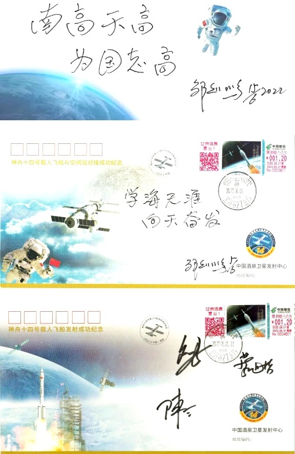 神舟十四号发射前,校友邹利鹏携航天员为“南高”送上签名和祝福