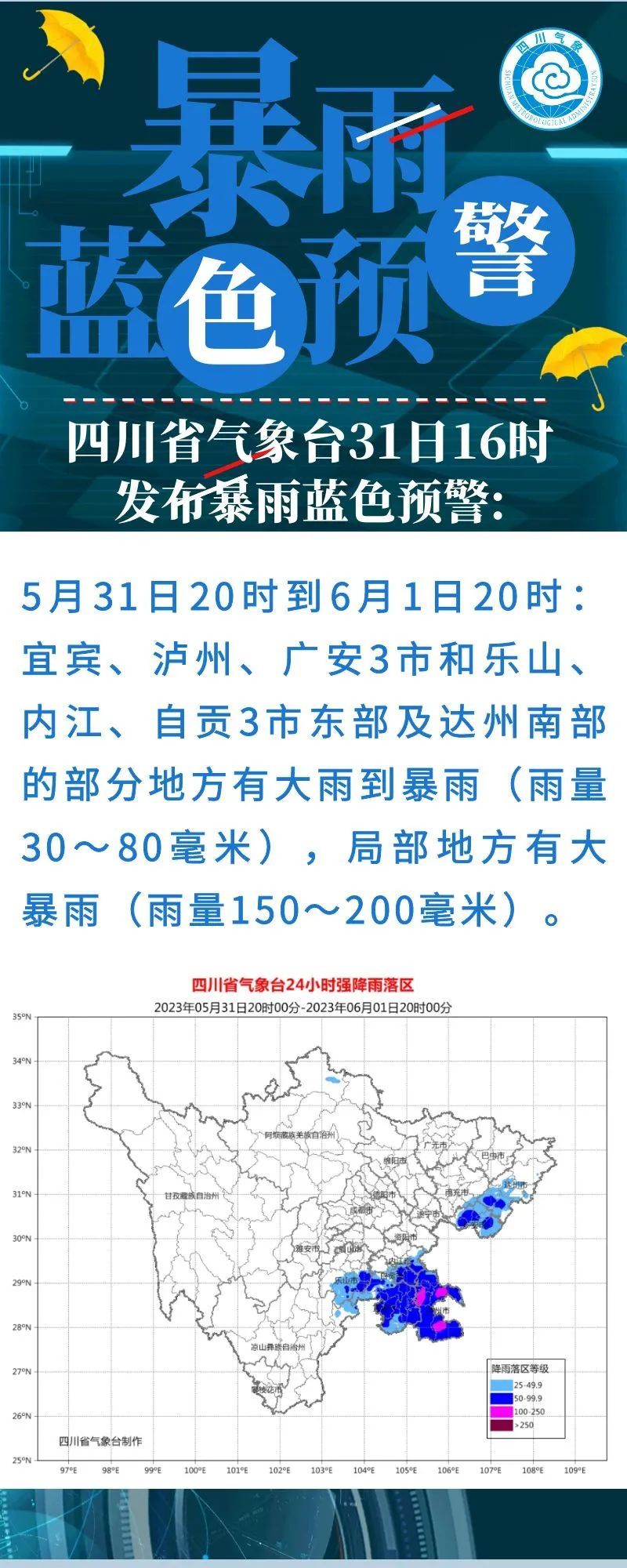 四川省气象台5月31日16时发布暴雨蓝色预警: