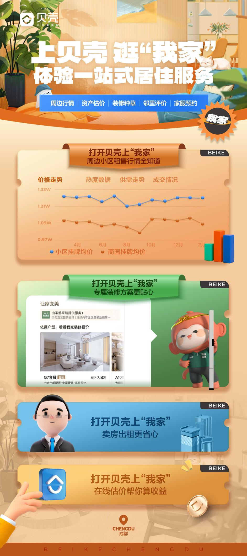 “我家成交价是多少?”“看看邻居怎么装修?”“看懂我家户型。”……近期,贝壳APP全新升级改版,在成都区域上线了“我家”频道,集合了房产买卖租赁、家装家居、家服等功能,为用户打造一站式的房屋信息与服务平台。