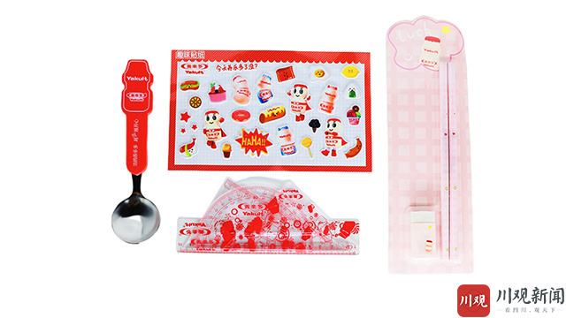 每套含养乐多透明套尺1份,养乐多卡通贴纸1份,养乐多粉色铅笔橡皮套装1份,养乐多不锈钢勺子1份