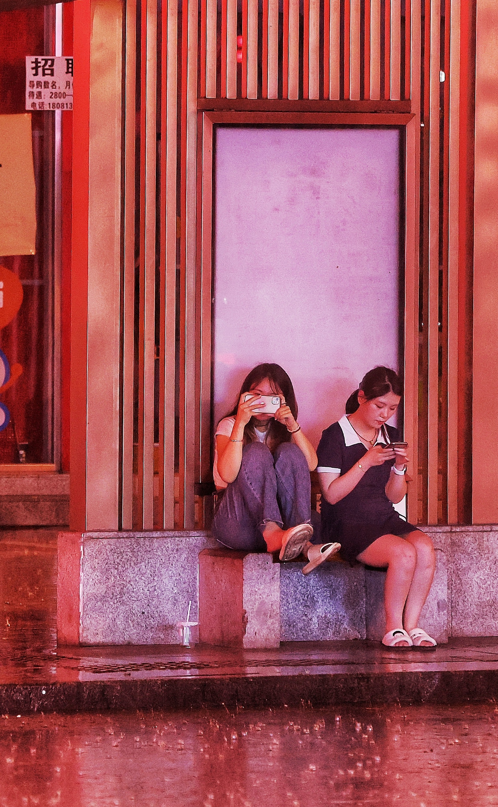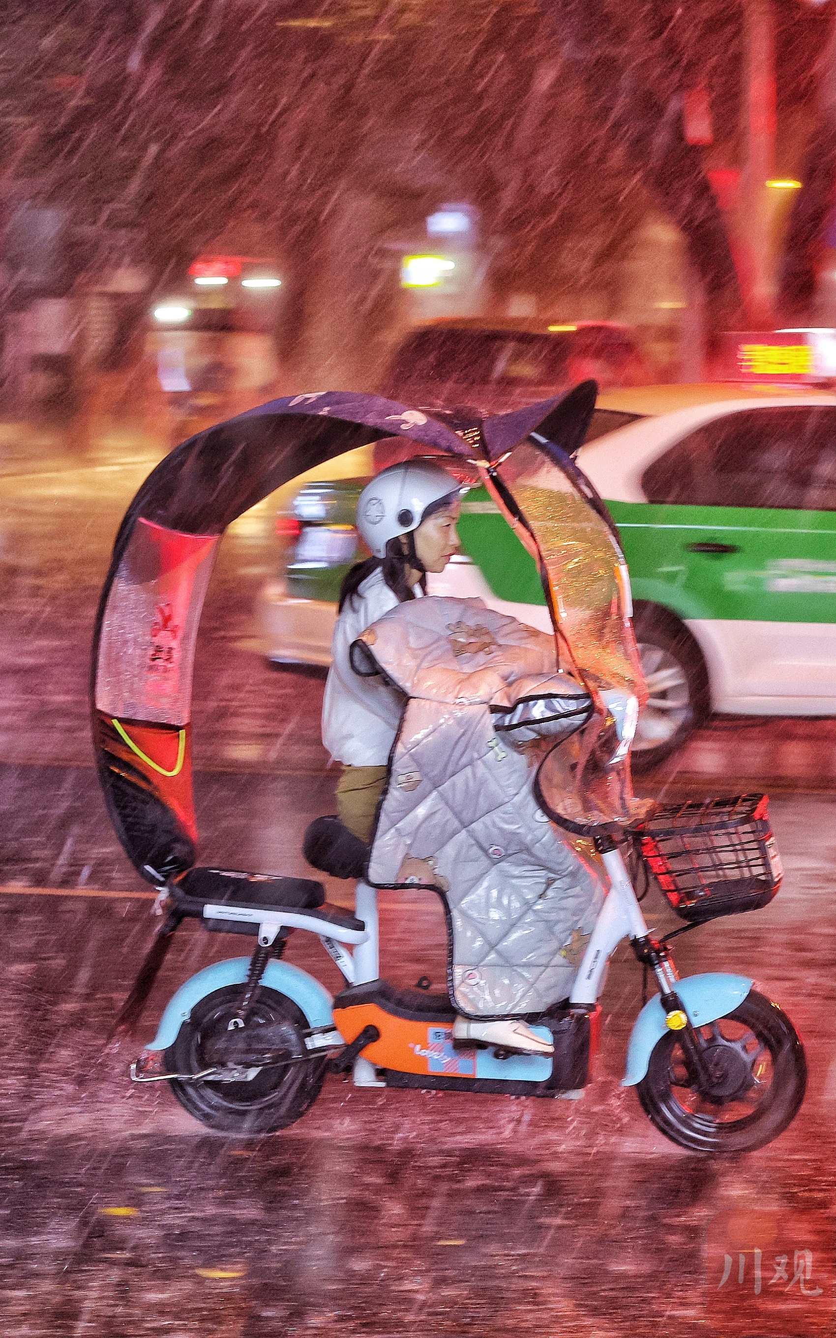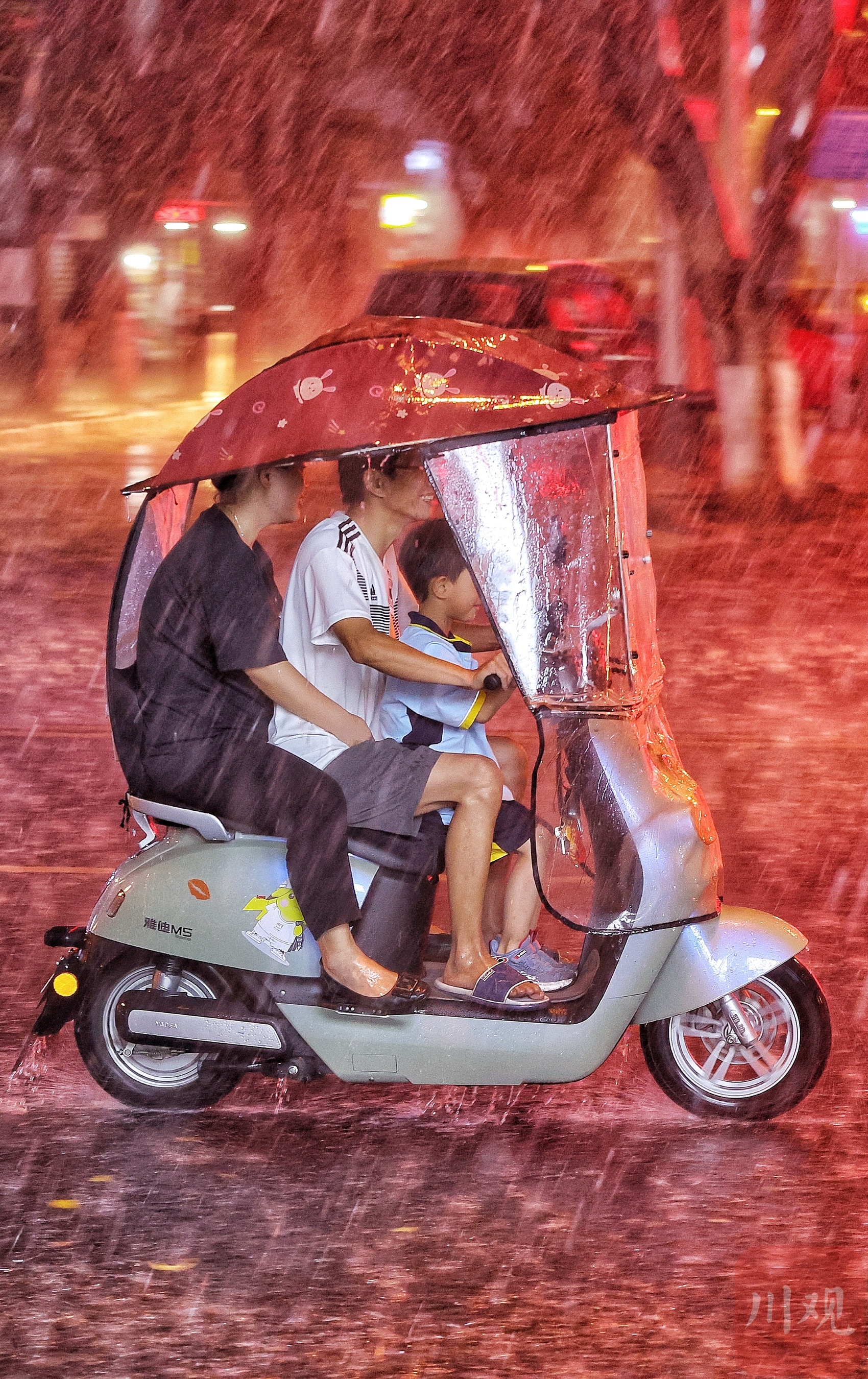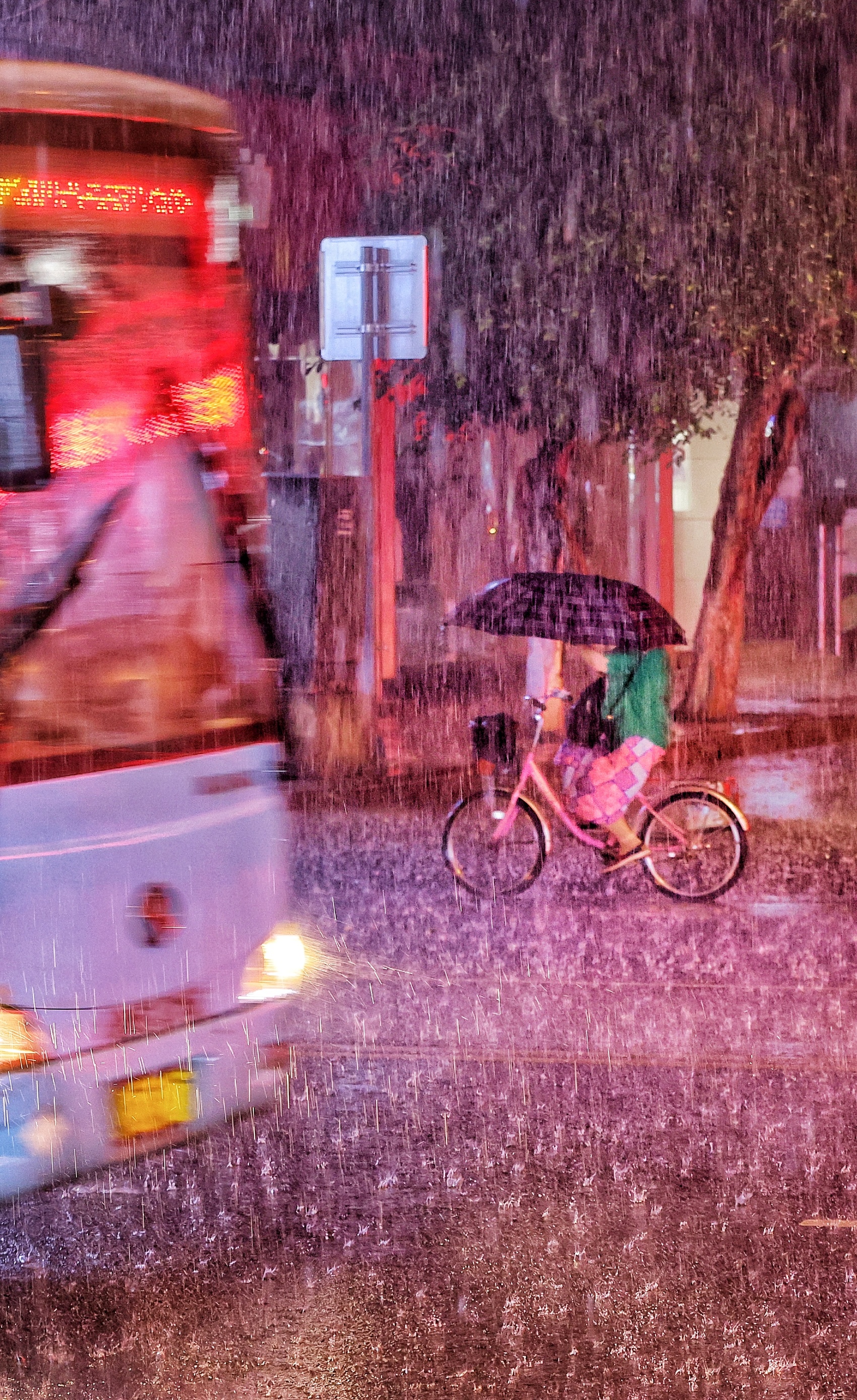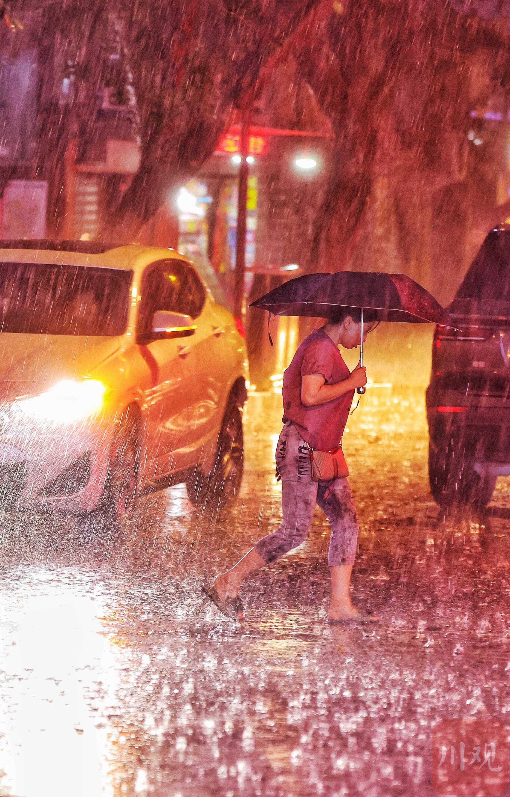 市中区嘉定南路上,行人或撑伞急趋,或骑车快行。雨中自拍的路人难掩眉眼间的喜色,雨夜终于凉爽了。