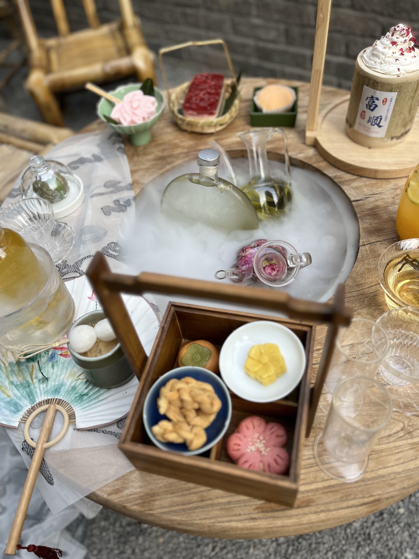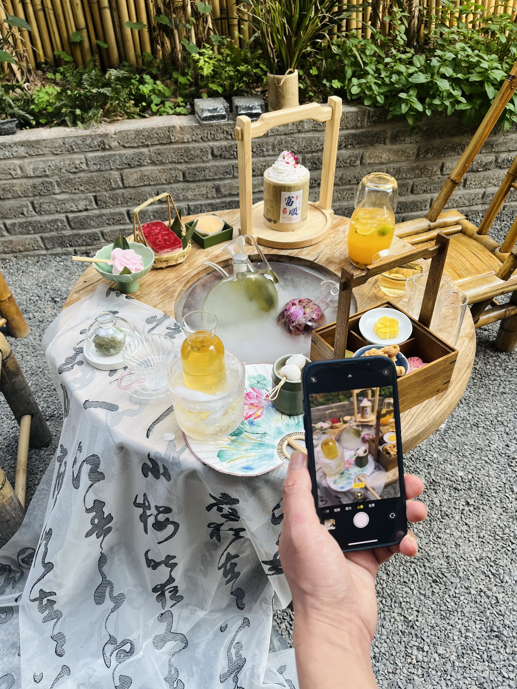 不止于茶,氛围感才是“围炉冰茶”的灵魂。成都的知北营地将“围炉冰茶”放在年轻人喜欢的露营地,绿野、蓝天里,一杯冰茶,让人备感轻松和惬意。在自贡市富顺县西湖旁,无事清欢神仙茶馆藏于林荫间。“90后”主理人黄旭介绍,茶馆名源于苏东坡的诗句“人间有味是清欢”。为了营造氛围,他们将书法、绘画等引入,不仅设桌案,让顾客可以体验饱含书香画意的中国传统文化,还将书有书法作品的白纱悬挂于空中,隔离空间的同时,也让雅静的文化气息流动。蒲扇、绿植、竹藩篱穿插其中,营造出岁月静好的氛围感。他们还将甜点做成富顺西湖的造型,让不少消费者备感亲切。