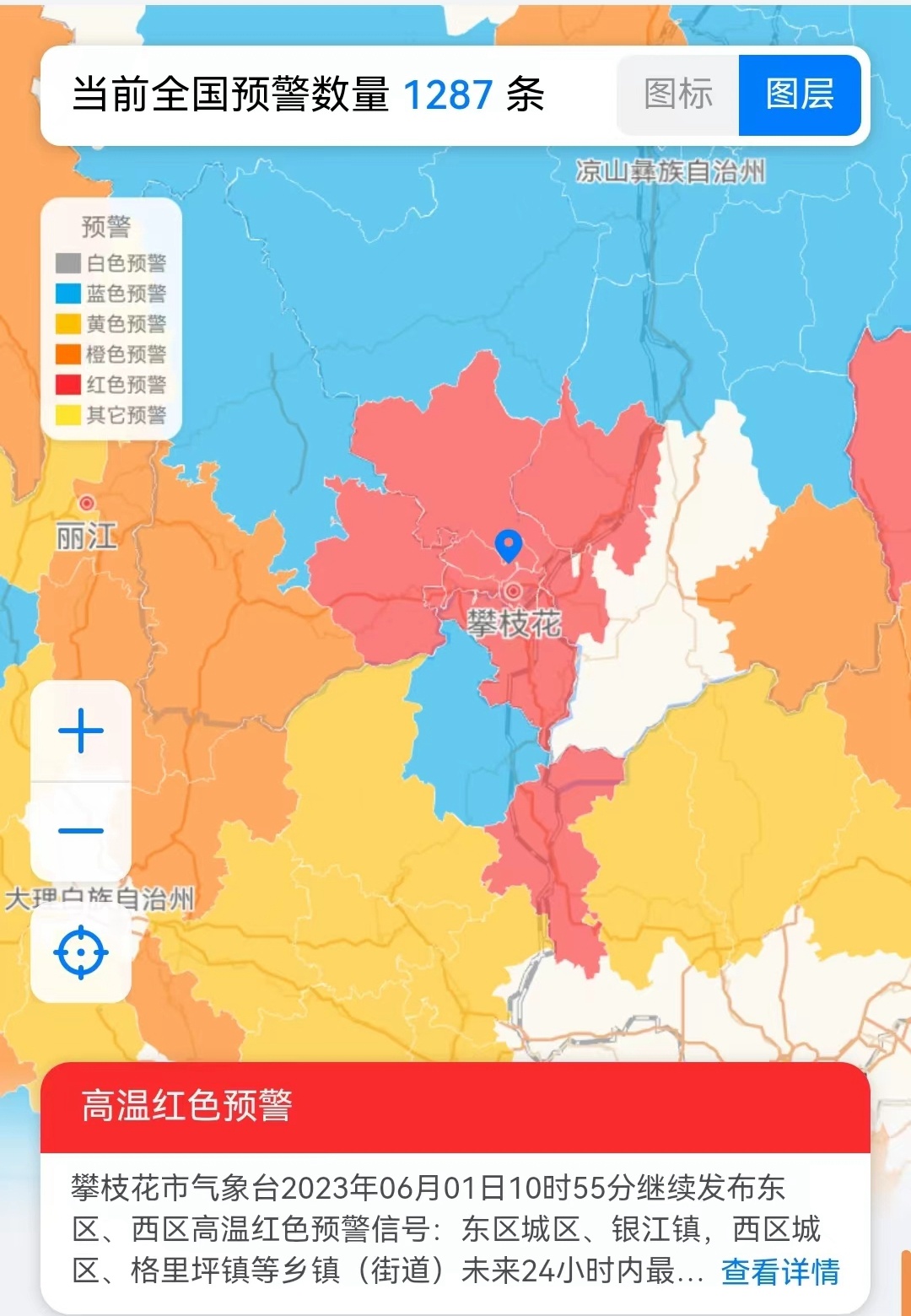 位于金沙江干热河谷地区的攀枝花市,5月29 日开始,部分城区最高气温已突破 40℃,其中:盐边县城区 5 月 29 日最高气温41.7℃,创历史极值;米易县城区 5月 31 日最高气温 41.6℃,创历史极值;市区和仁和区城区5月31日最高气温分别为 42.0℃和 40.5℃。