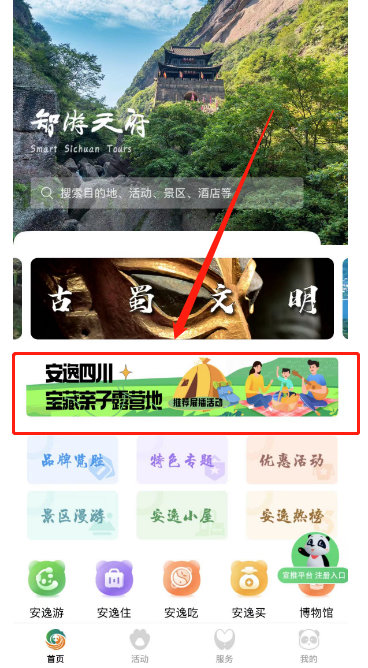 【第二步】在智游天府客户端首页,找到“四川宝藏亲子露营地”活动,点击参与。
