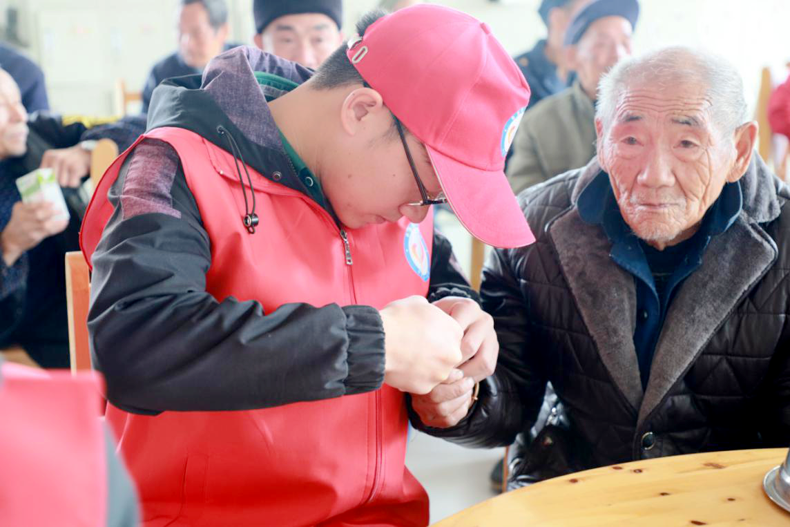 今年62岁的文宫敬老院工作人员童贵钦,是文宫镇的一名退休村党支部书记,他握着职工志愿者服务队负责人说,感谢你们能够经常来看望我们,让敬老院的孤寡老人和重度残疾老人感受到了社会各界对我们的关爱,让老人们的心理更加开放和健康。(金馗等供图)