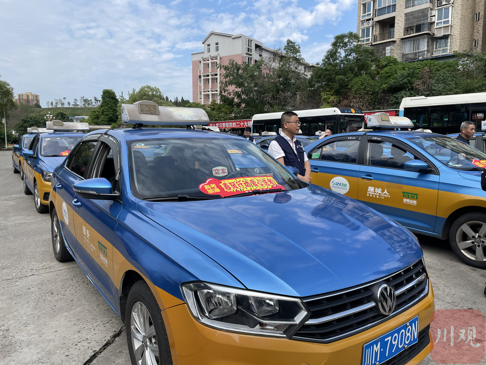 现场,驾驶员张贴爱心送考车贴,高考考生可凭借高考准考证免费搭乘“爱心送考”车辆。资阳城市公共交通有限责任公司相关负责人介绍,为考生营造一个便捷、安全、高效的高考出行环境,该公司运用智能调度系统,对途经各考点的公交线路客流及车辆进行观察、监控,及时将客流信息和各考点交通管制的情况反馈给集中调度中心,以便对线路运力进行合理调派。