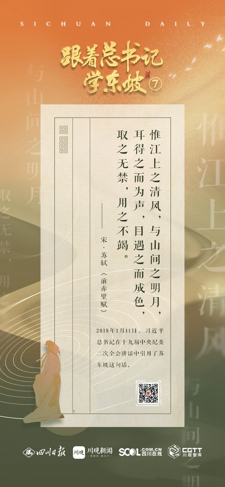 2023年6月7日,《跟着总书记学东坡》系列短视频播出第七期,本期关注东坡名言:“惟江上之清风,与山间之明月,耳得之而为声,目遇之而成色,取之无禁,用之不竭。”