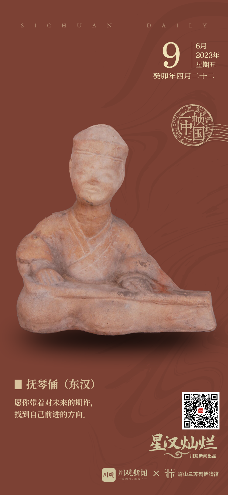 该抚琴俑表现的是一位民间艺人在抚琴演奏的情景,头戴小圆帽,身着宽衣博袖的长衫,双腿盘坐于地,双手抚琴,神情专注,技艺娴熟,面带微笑足以看出激情和自信!