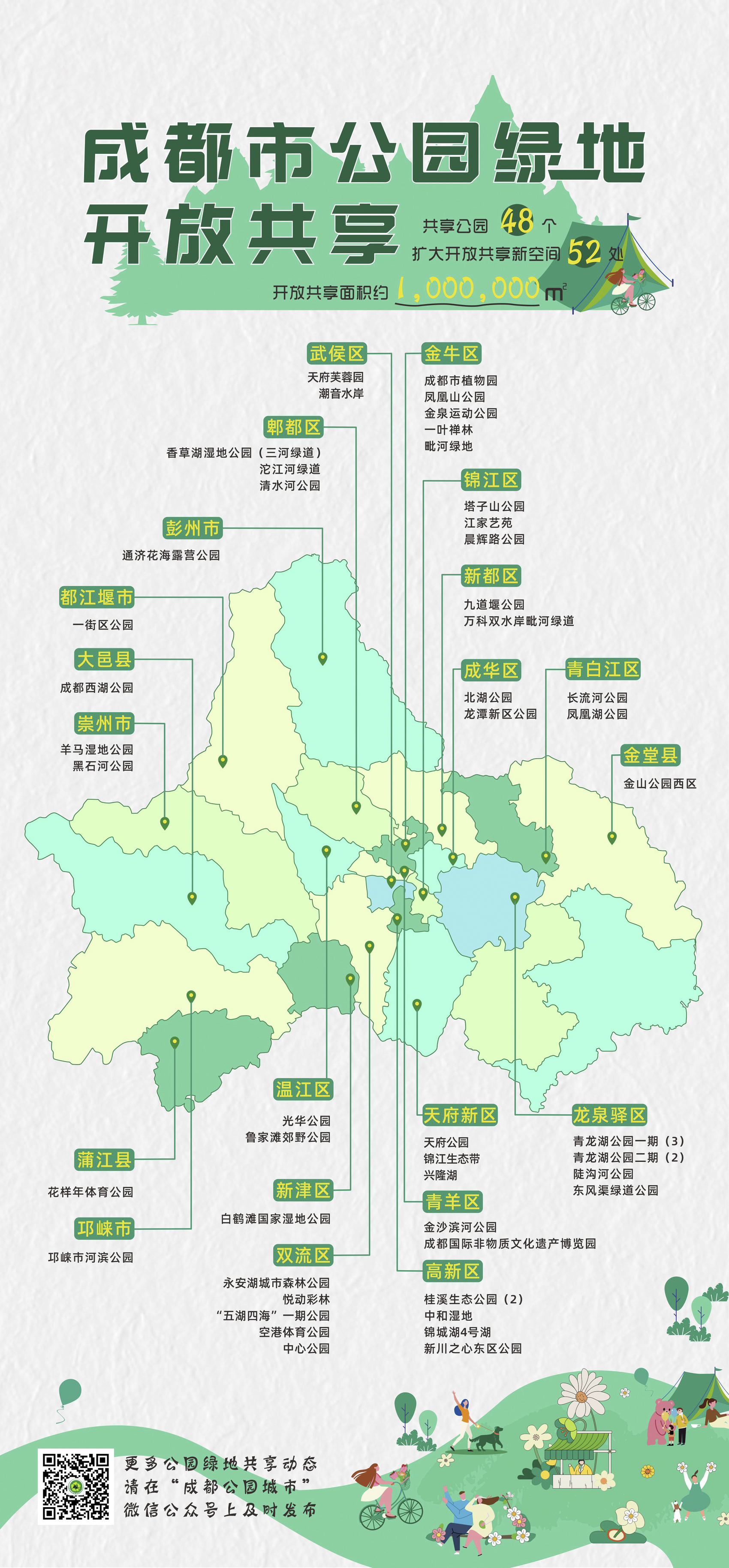 6月6日,成都市公园城市建设管理局正式发布《成都市公园绿地开放共享地图》。根据本次发布的地图所示,截至目前,全城共有48个共享公园扩大开放共享新空间52处,每个点位均大于1000平方米,累计开放面积约100万平方米。