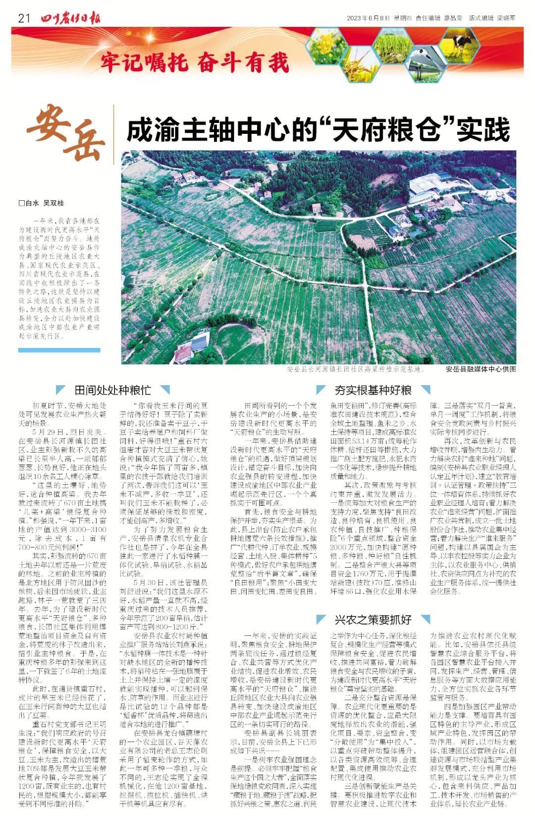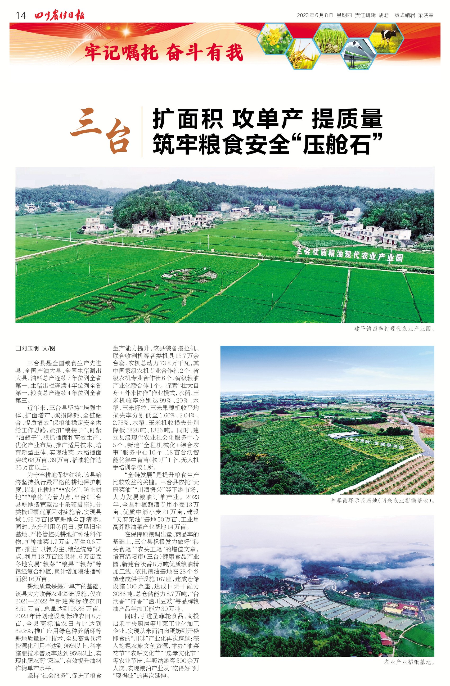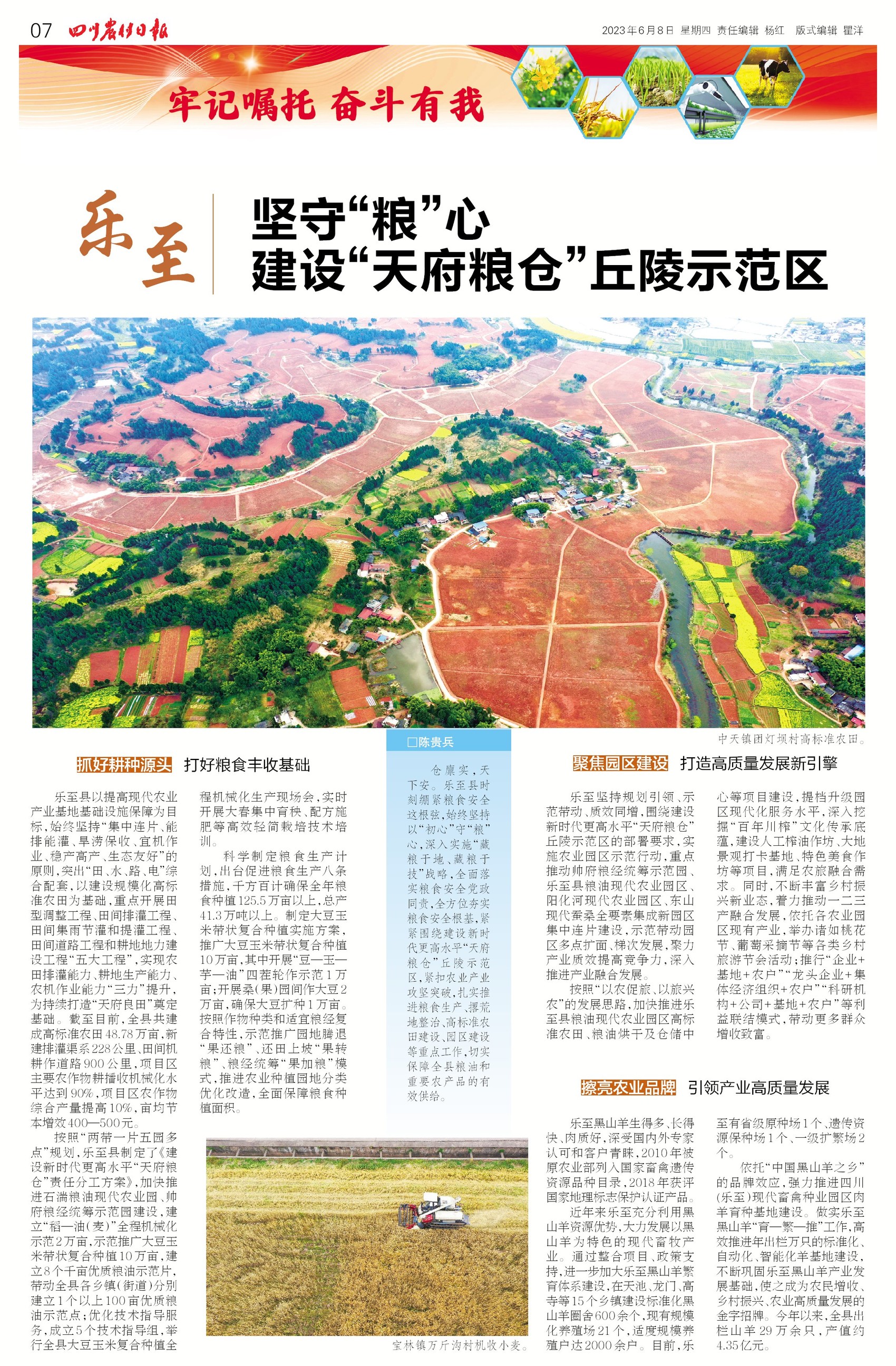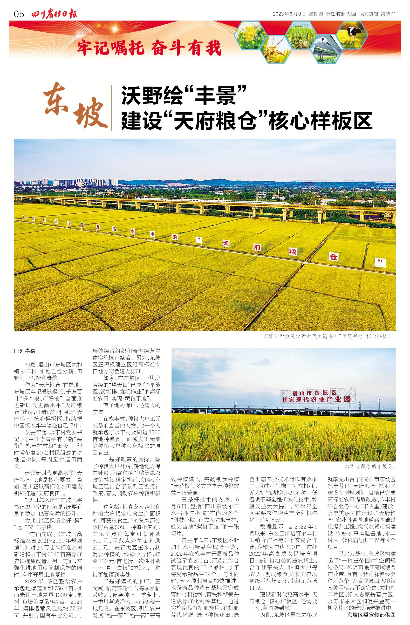 去年6月8日,习近平总书记来川视察,首站前往眉山市东坡区太和镇永丰村,强调要把粮食生产抓紧抓牢,在新时代打造更高水平“天府粮仓”。