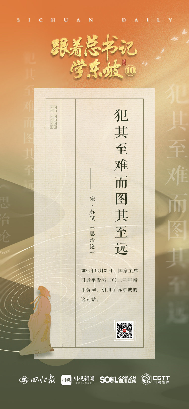 2023年6月10日,《跟着总书记学东坡》系列短视频播出第十期,本期关注东坡名言:“犯其至难而图其至远。”