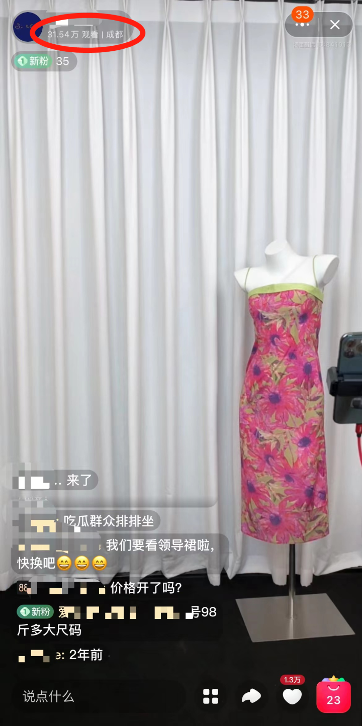 但就在发布公告的同时,售卖该裙子的店铺也顺势开启了直播。6月8日下午,该店铺直播间挂着这款“引流裙”,两位主播在边上试穿不同款式的衣服,和网友火热互动。短短几个小时,直播间人数冲到30多万。目前,该账号拥有粉丝19万。