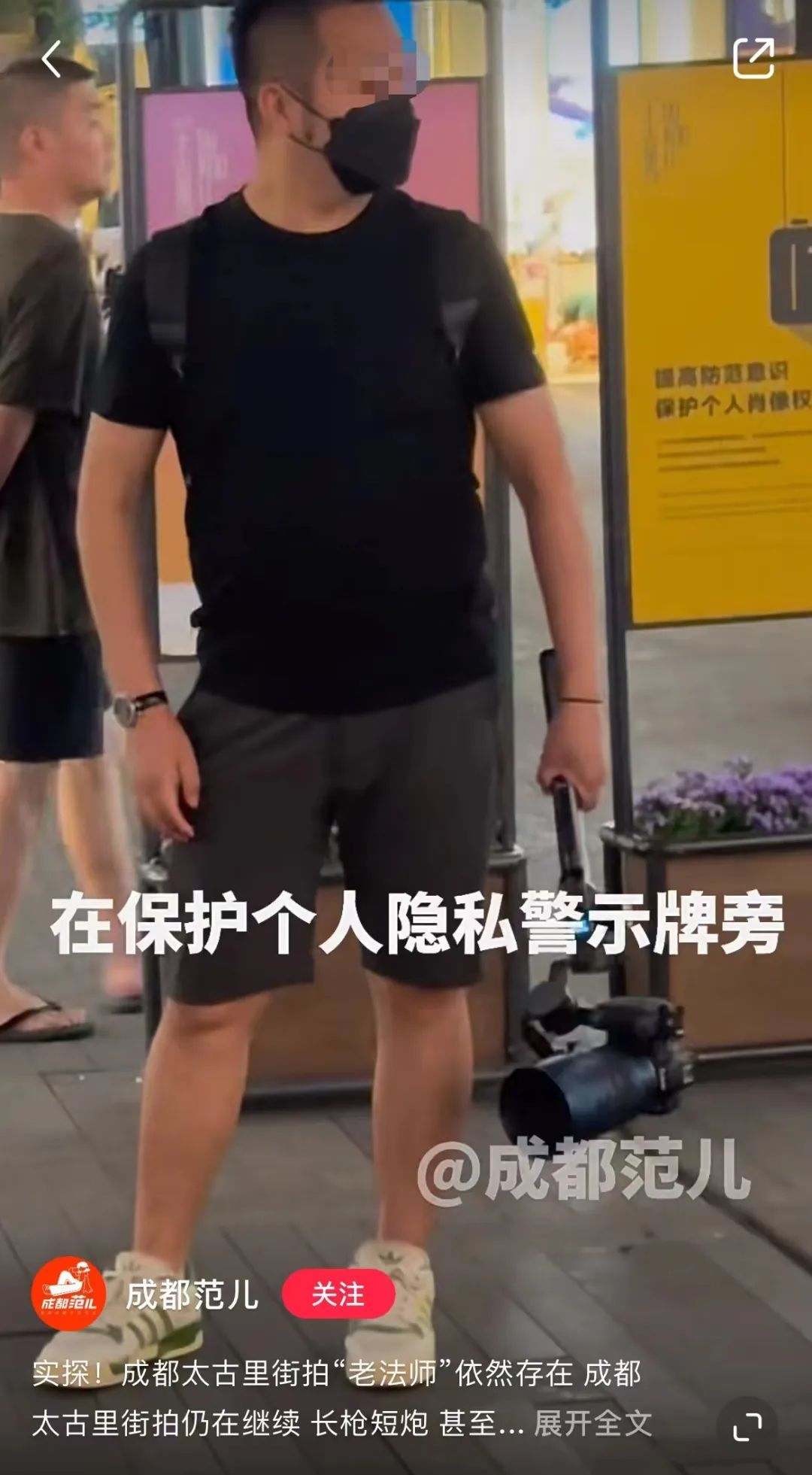 一名手持专业相机的摄影师站在“保护个人肖像权”的警示牌前 图据成都范儿小红书