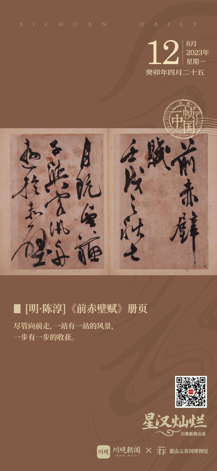 眉山三苏祠博物馆收藏的明代书画大家陈淳作品《前赤壁赋》为册页,风格豪迈遒劲,笔意挥洒自如,最能表现陈淳“率意纵笔”的书法风格。在历代书《赤壁赋》的作品中,草书并不多见,名家草书更是难得。