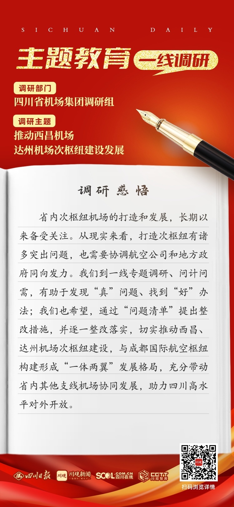 省内次枢纽机场的打造和发展,长期以来备受关注。从现实来看,打造次枢纽有诸多突出问题,也需要协调航空公司和地方政府同向发力。我们到一线专题调研、问计问需,有助于发现“真”问题、找到“好”办法;我们也希望,通过“问题清单”提出整改措施,并逐一整改落实,切实推动西昌、达州机场次枢纽建设,与成都国际航空枢纽构建形成“一体两翼”发展格局,充分带动省内其他支线机场协同发展,助力四川高水平对外开放。