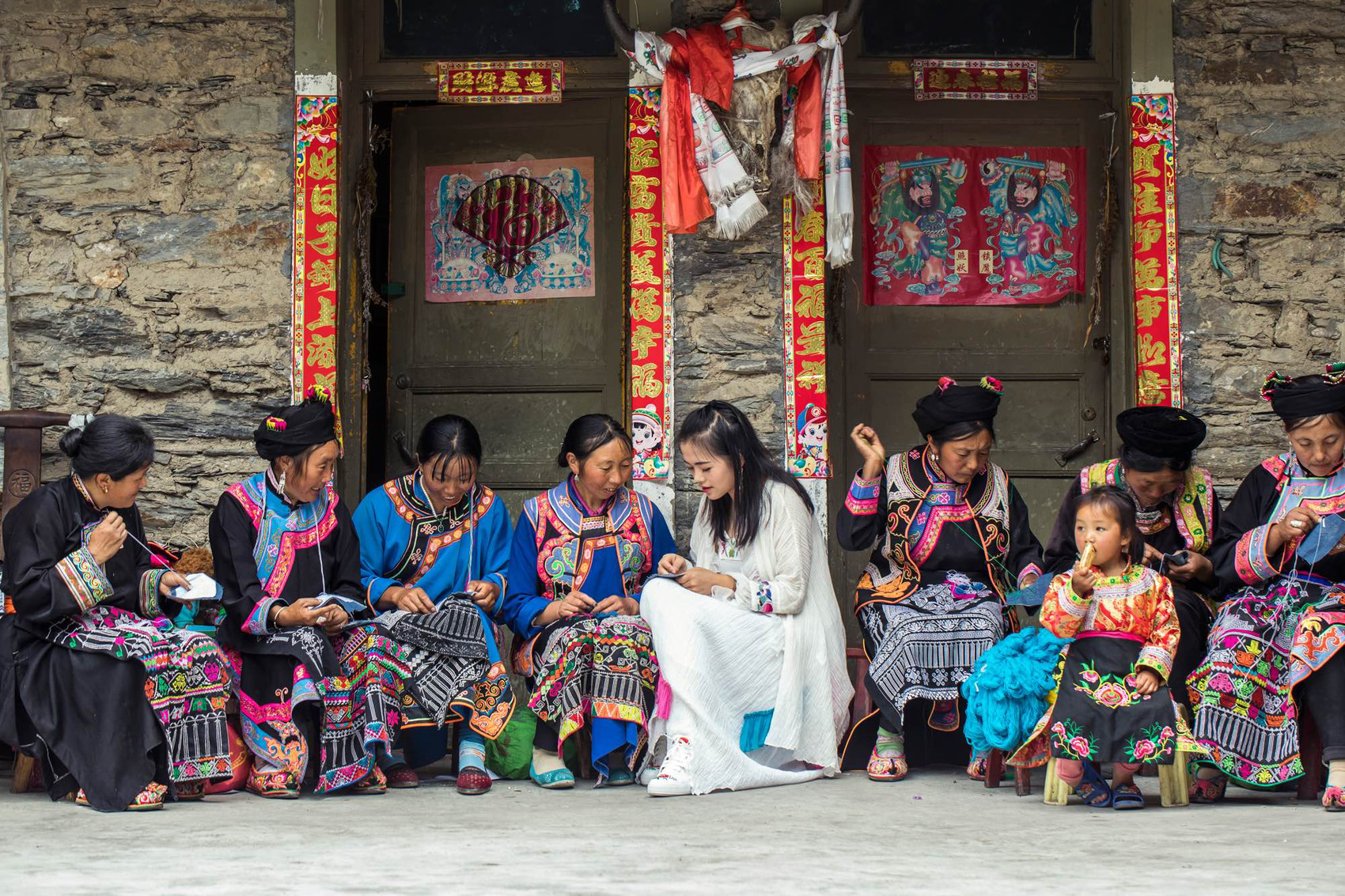 张居悦(中)与绣娘们在工坊工作。文旅厅供图