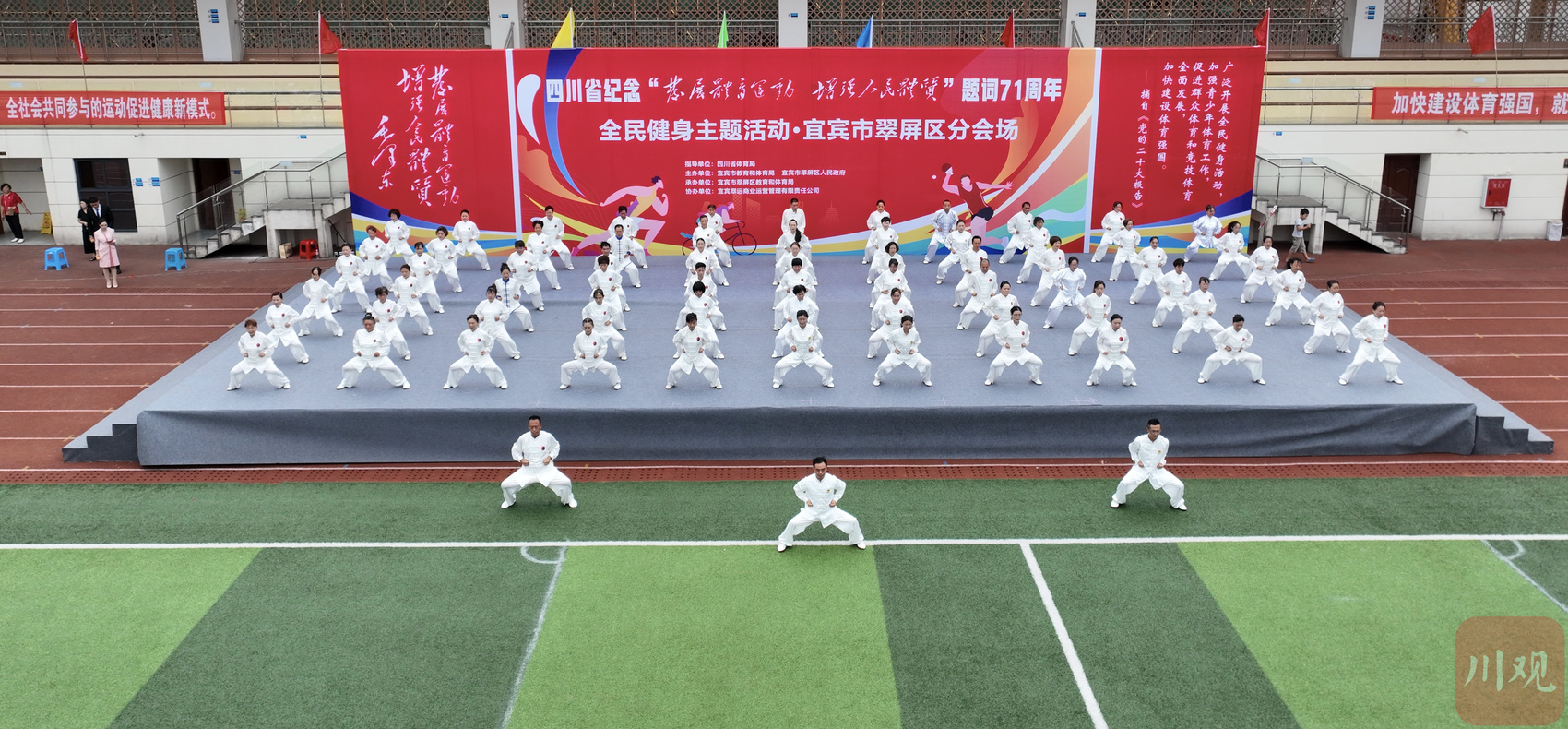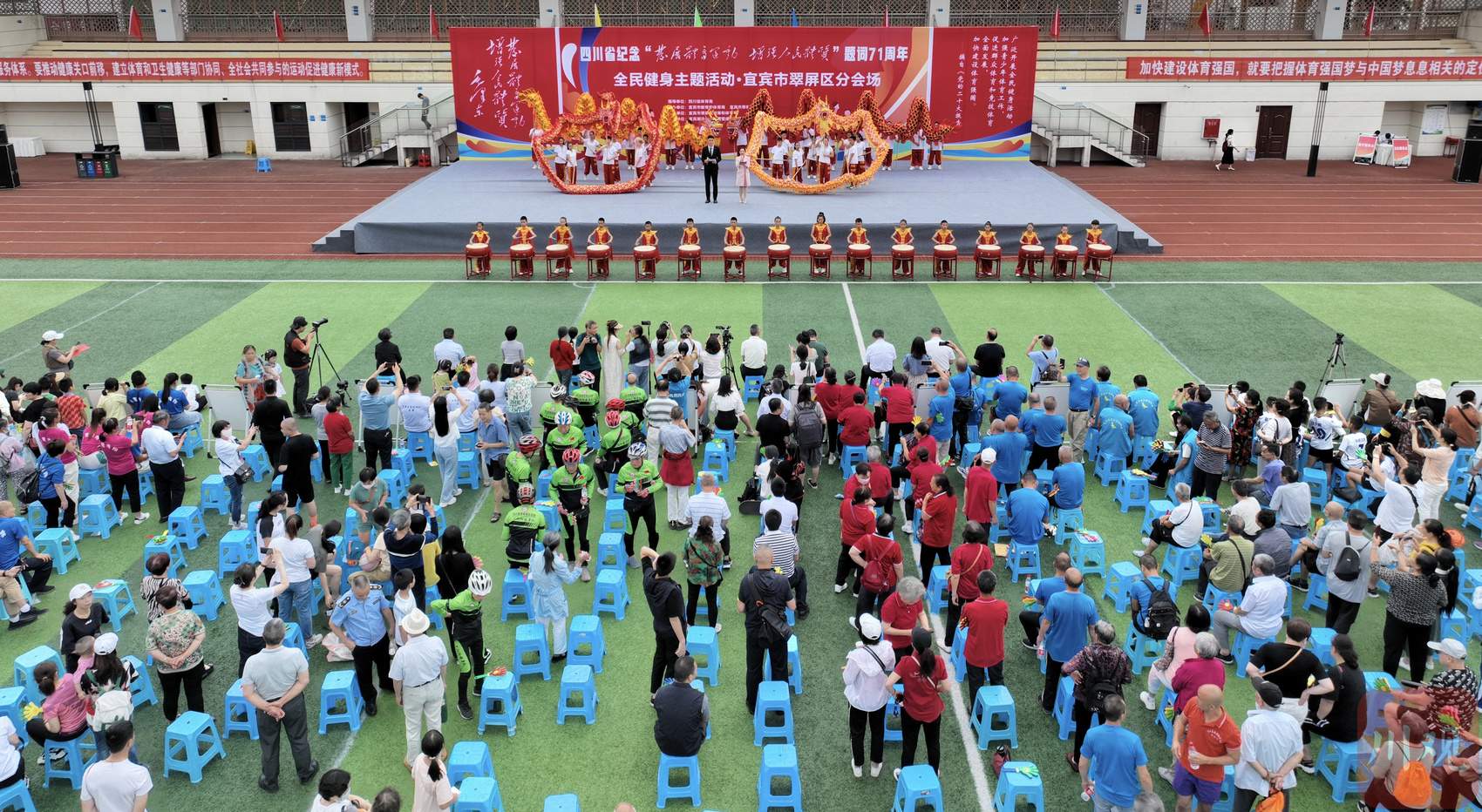 活动现场,旋律激昂的击鼓表演拉开了活动序幕,健身球操和柔力球、花式篮球、八段锦、拉丁舞、持杖操、功夫扇、草龙舞等节目轮番上阵,展示出翠屏区全民健身和群众体育运动蓬勃开展的丰硕成果,现场观众发出阵阵掌声;场外同步设置宣传台,为群众提供健身知识科普、咨询服务,引来广大群众问询、围观。