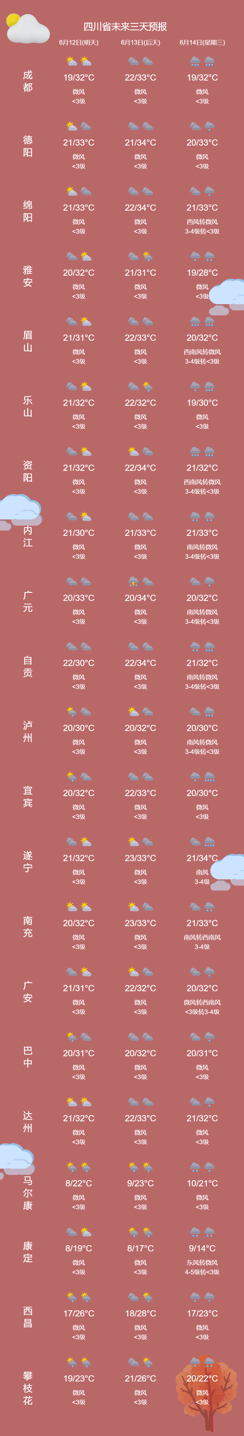 预计13~14日盆地大部以多云天气为主,川西高原和攀西地区多阵雨或雷雨,其中甘孜州和攀西地区局部地方有中到大雨;15~17日盆地阴天间多云,多阵雨或雷雨,其中东部和北部有中到大雨,局部暴雨;川西高原和攀西地区多雷阵雨。
