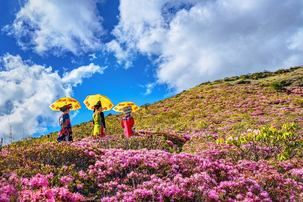 如果说,会理县龙肘山的杜鹃花尚有几多文化养分的话,那么金阳县波洛梁子的杜鹃花则富有天然野趣了。已是初夏,山中的杜鹃花才姗姗来迟、粉墨登场。波洛梁子地处热柯觉乡,这里的杜鹃花有10万亩,种类也有50余种。置身花海,人们抑制不住冲动,相机的快门声雨点般密集,感叹不已的赞美声此起彼伏。彝族著名诗人倮伍拉且提笔写出诗句:“索玛花盛开的日子/来到山坡上/花的芬芳/浸透我们的肌肤/浸透我们的呼吸/芳香着我们的五脏六腑;索玛花年年都会盛开/我们年年都来/让目光辽阔地展开/让缤纷的色彩/把目光/染得色彩缤纷……”