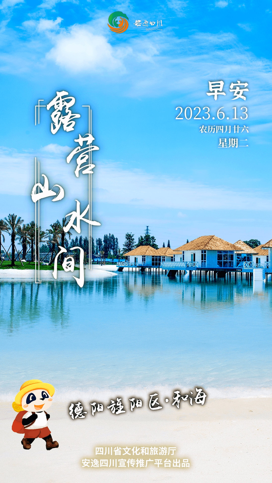 6月13日,星期二。今日安逸四川日历海报继续初夏之旅,走进德阳市旌阳区的中国·和海景区,来一场山水间的露营体验。