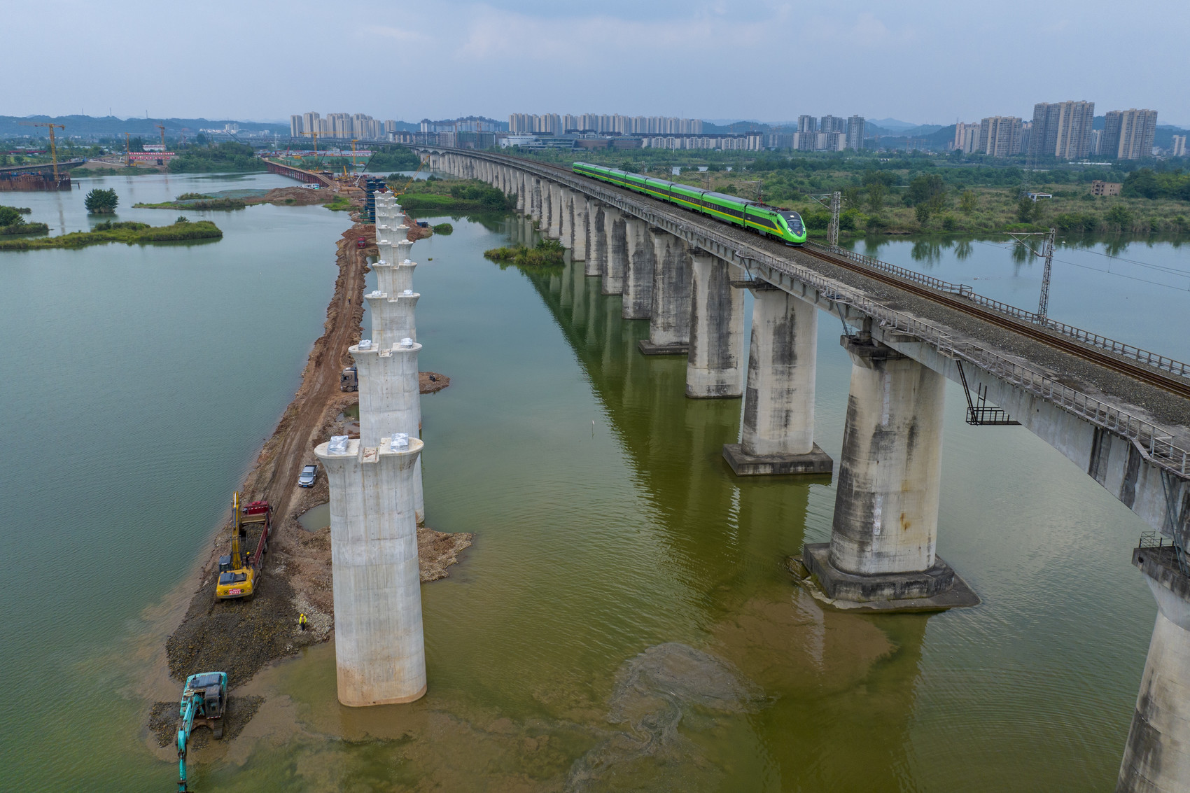 成达万高铁遂宁涪江特大桥部分桥墩已完工,旁边一列动车组快速驶过。成达万高铁公司供图