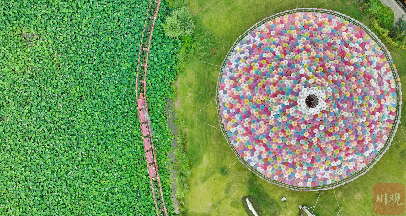 2023年6月13日,游客乘坐小火车在成都市双流区黄水镇杨公社区的印象荷花景观内休闲赏景。