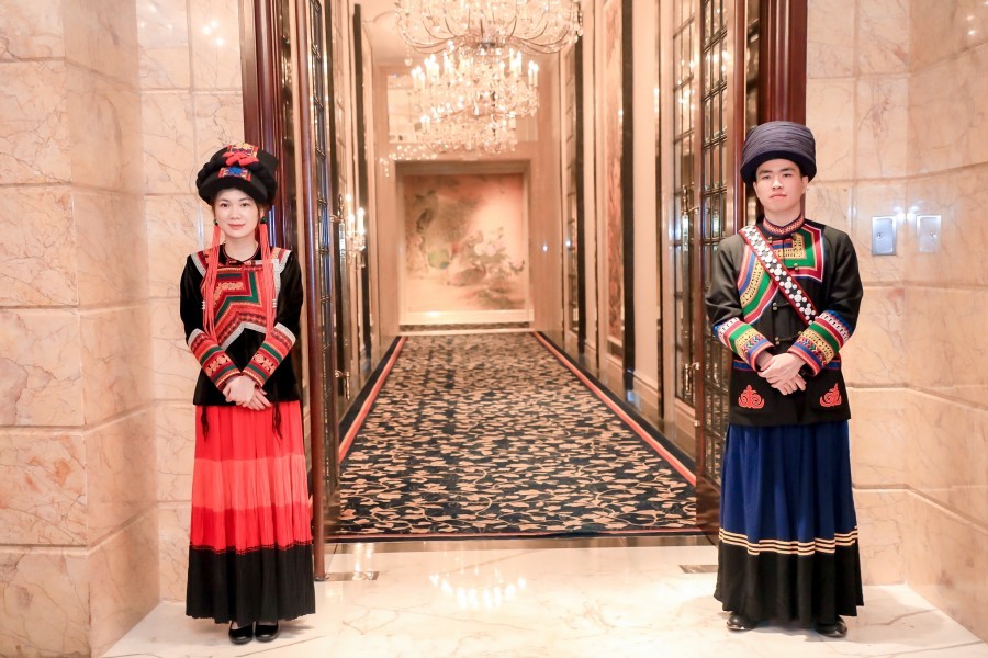 礼仪穿上峨边彝族服饰,吸引人眼球。