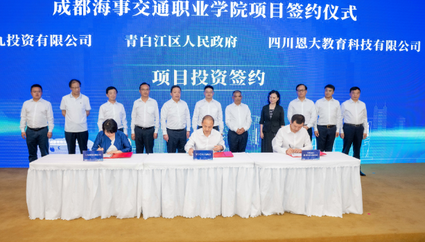 6月13日,成都海事交通职业学院项目签约仪式在成都市青白江区举行,青白江区与四川恩大教育科技有限公司、三九投资有限公司合作,携手建设成都海事交通职业学院。
