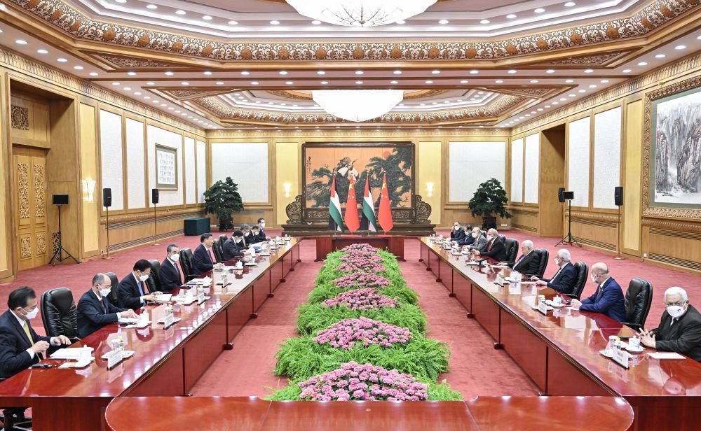 6月14日下午,国家主席习近平在北京人民大会堂同来华进行国事访问的巴勒斯坦总统阿巴斯举行会谈。新华社记者 殷博古 摄