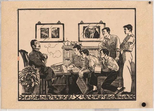 黄永玉木刻作品《鲁迅和木刻青年》 上海鲁迅纪念馆提供
