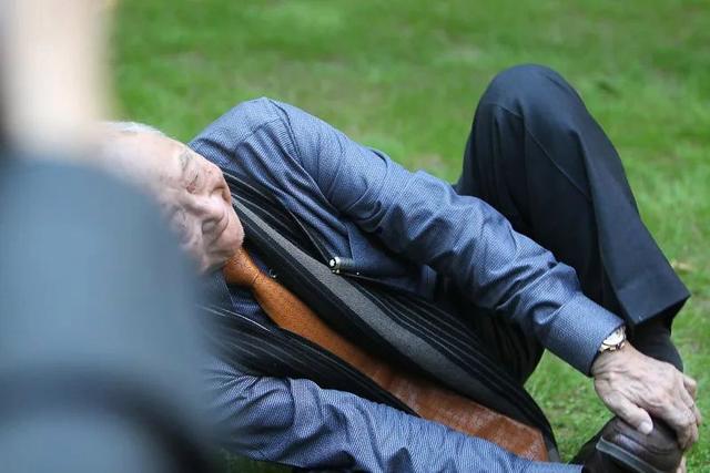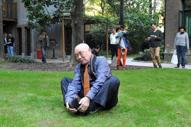 2013年10月28日下午,黄永玉来到巴金故居,为铜像《新世纪不再忧伤》揭幕。仪式结束后,90岁的他像孩子似的盘腿在草坪上打滚。蒋迪雯 摄