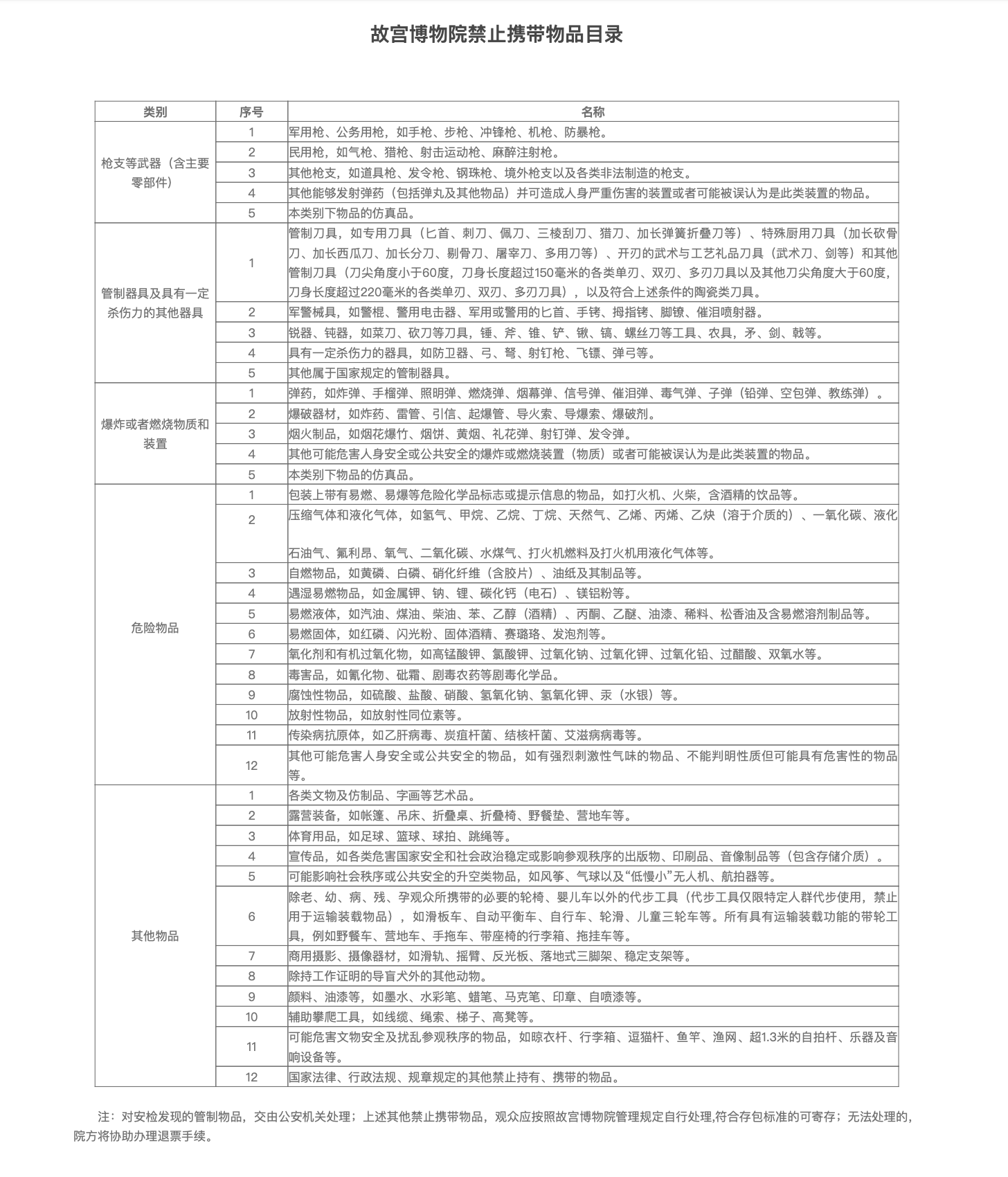 1、为保证古建、文物和观众的安全,建立良好的参观秩序,入院前请自觉接受安全检查,禁止携带物品详见《故宫博物院禁止携带物品目录》。安检发现的管制物品,将交由公安机关处理。目录中其他禁止携带物品,观众应按照故宫博物院管理规定自行处理,符合存包标准的可寄存。无法处理的,院方将协助办理退票手续。