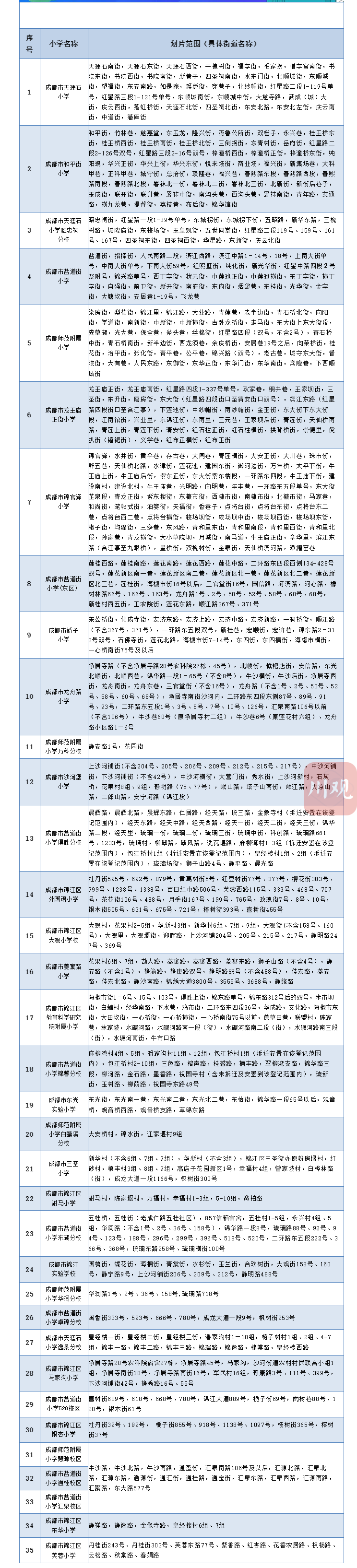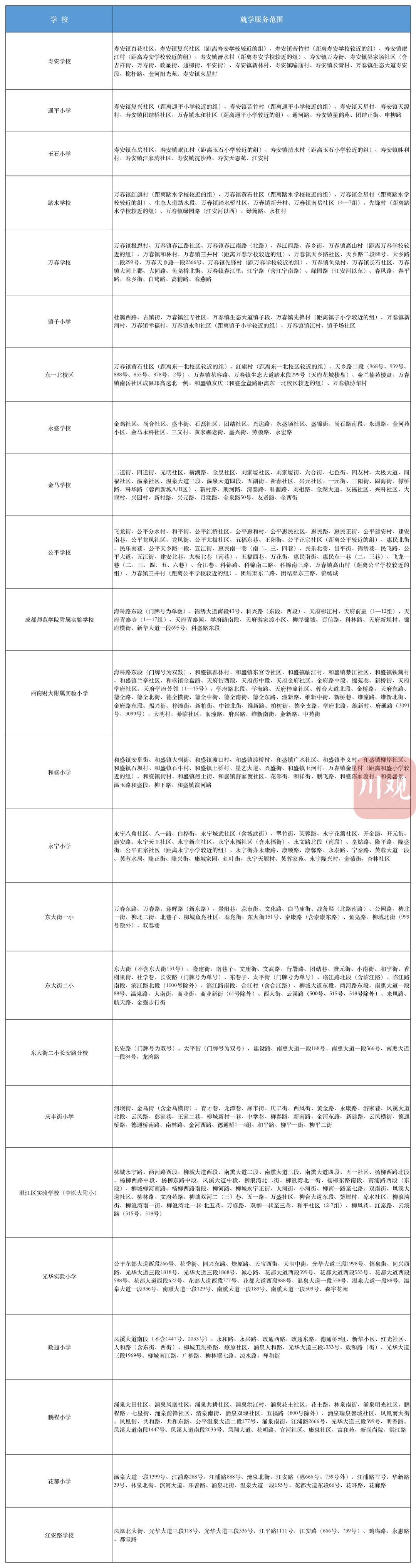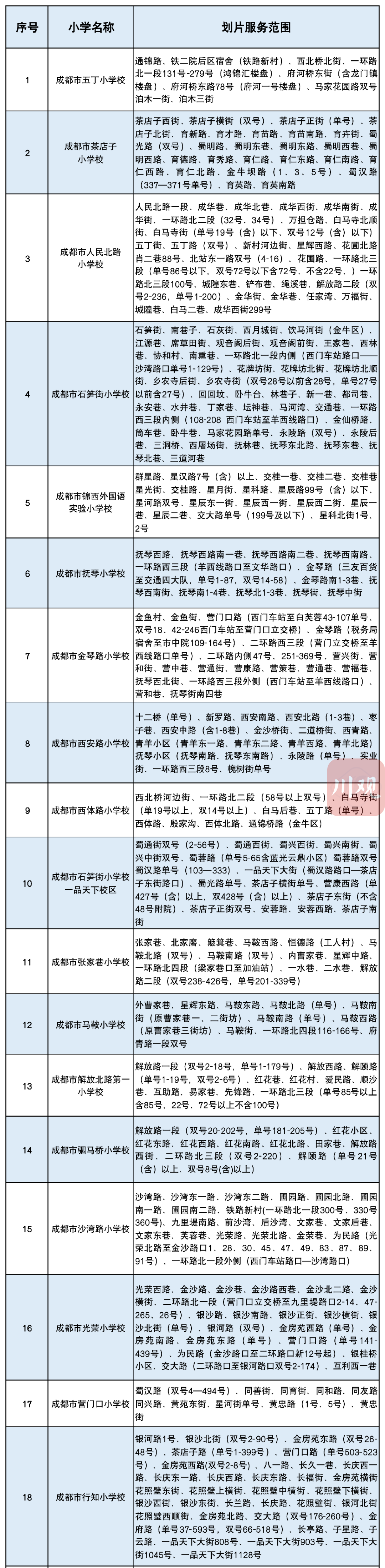 划片范围涉及道路名称:方池街、蜀华街、横小南街、蜀都大道(金河路南侧、通惠门路南侧)、祠堂街、小南街西侧(包家巷以北)、包家巷。
