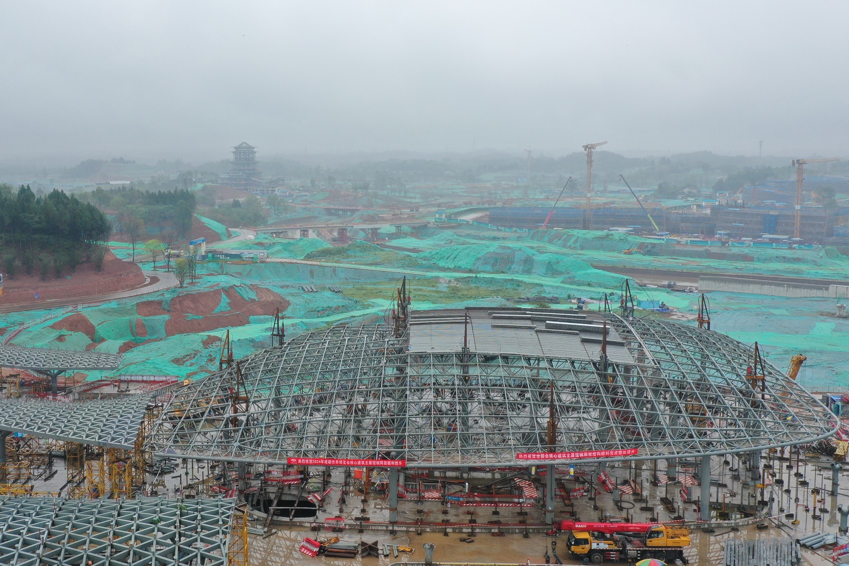 6月14日,重达650吨的钢网架在空中精准就位,“神鸟衔花”雏形初显,标志着2024年成都世界园艺博览会园区项目主展馆主体结构封顶。