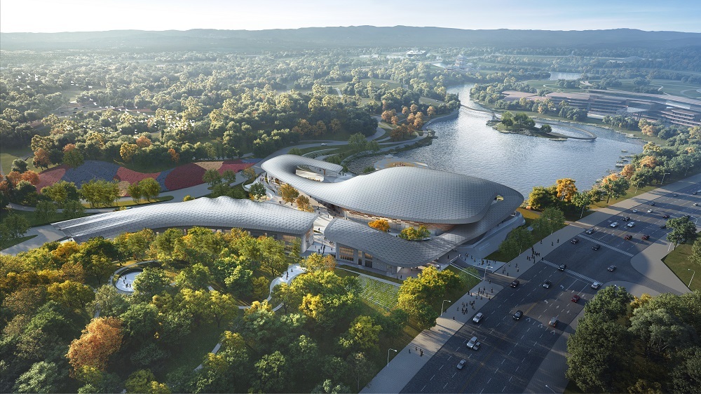 2024成都世园会主展馆位于成都东部新区,以三星堆神鸟图案为原型,东临绛溪五线,北临摩诃湖,共有地下和地上两层建筑,将以“神鸟衔花”的建筑姿态承载2024成都世园会的开闭幕式以及展览演艺等功能。
