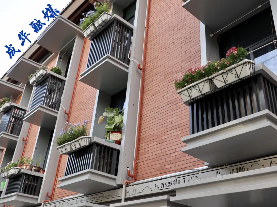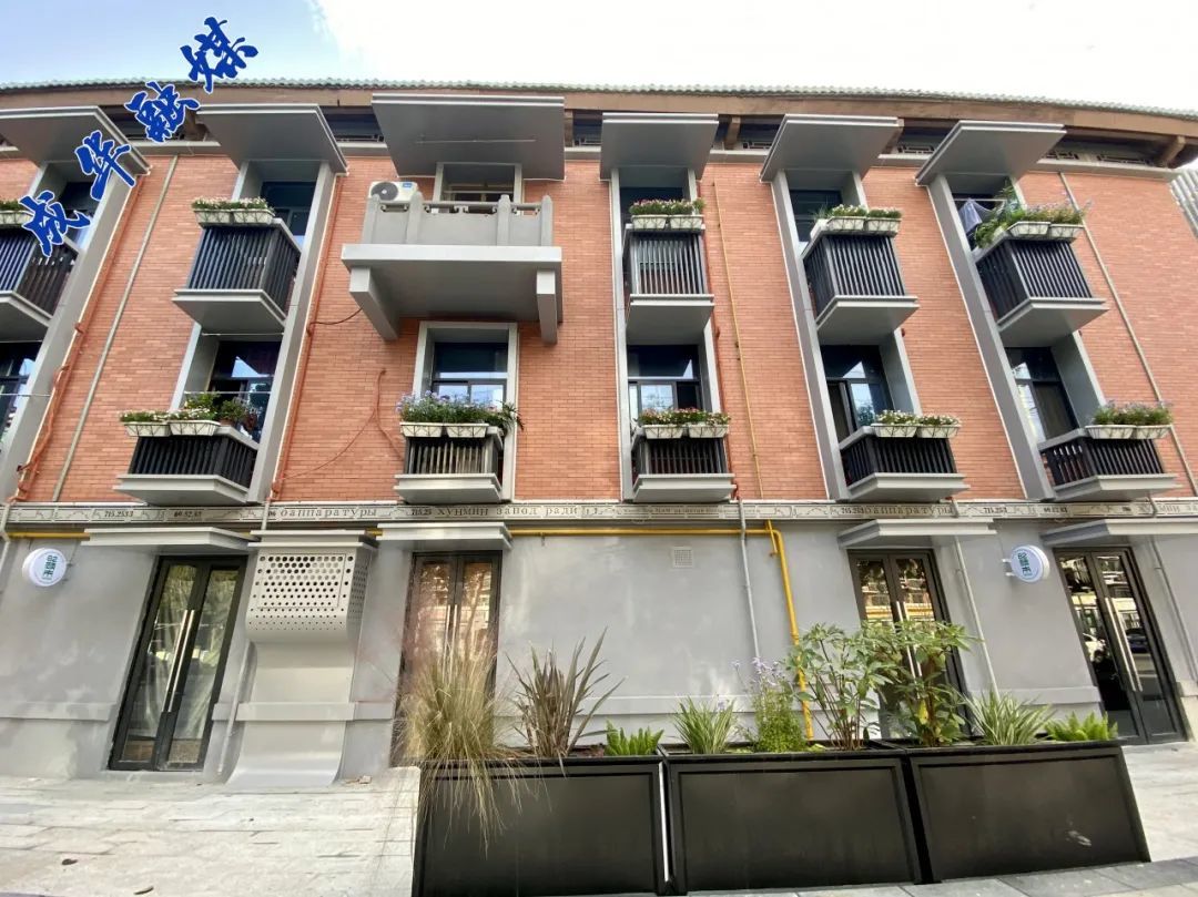 曾经斑驳的楼面变成了崭新的红色砖墙,外墙增添了统一样式的屋顶和阳台,复古的苏式风格建筑搭配生机盎然的绿植花卉……