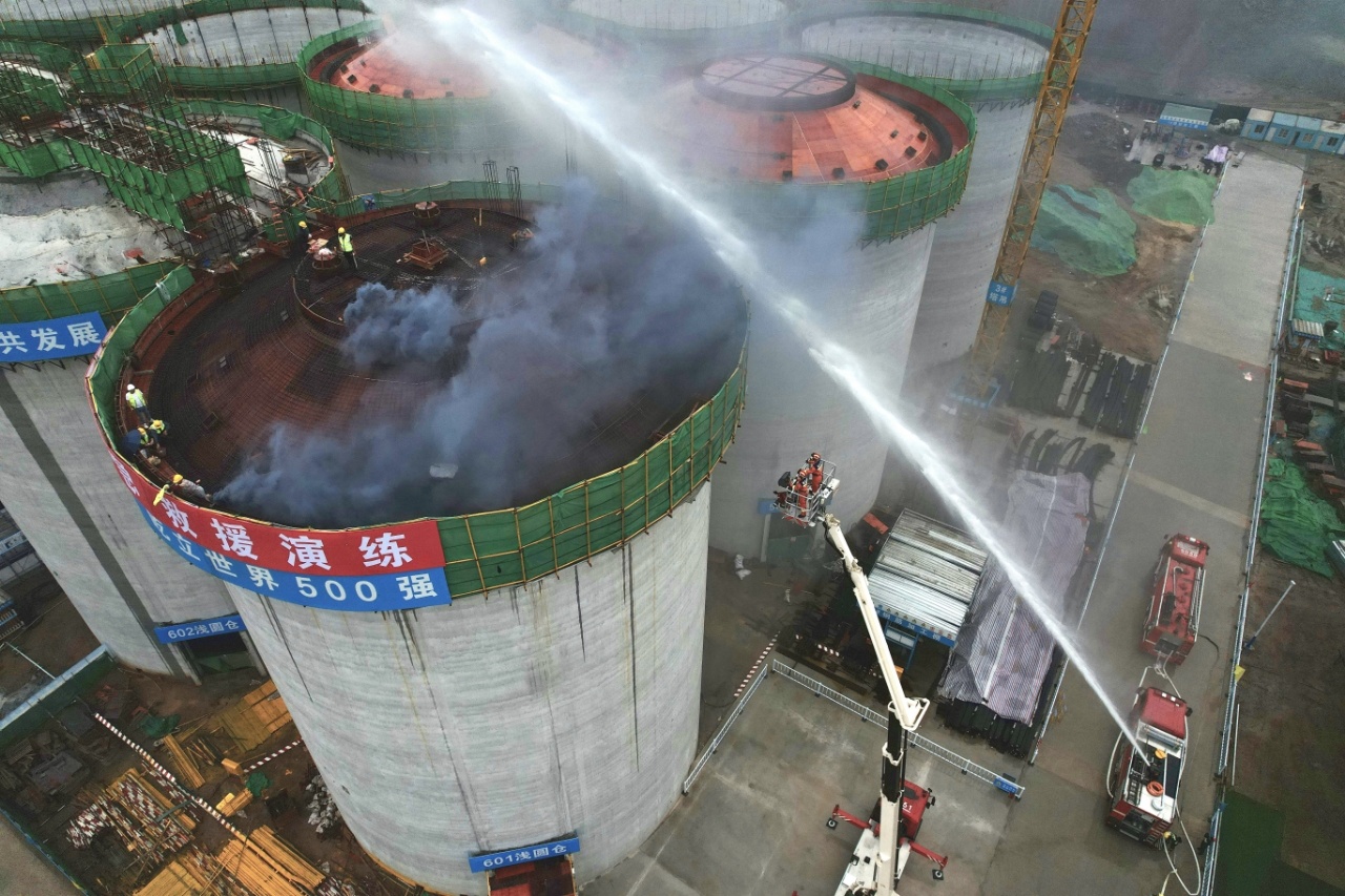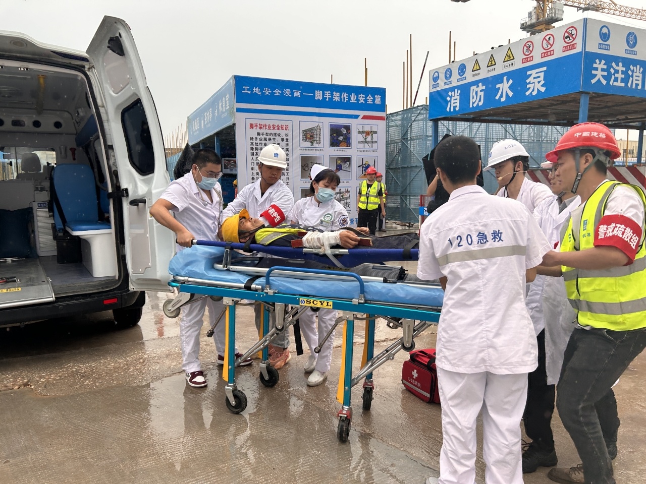 在当天的演练中,就模拟了一场火灾+高坠的安全事故。一在建粮食仓储项目仓顶突发大火,火势迅速蔓延,一名工人在逃生过程中不慎坠落陷入昏迷,另一名工人被困仓顶,情况十分危急。