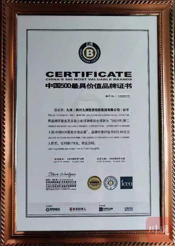 中国500最具价值品牌证书。 图片由九洲集团提供