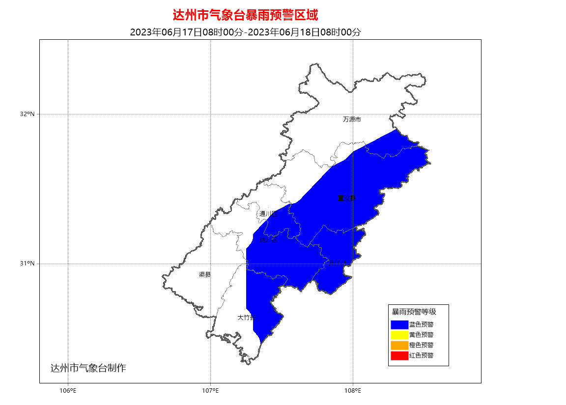 达州市气象台6月17日7时40分发布暴雨蓝色预警:预计6月17日白天到晚上,宣汉县、达川区、通川区、达州高新区、达州东部经开区、开江县、大竹县有大到暴雨(30~60毫米),最大小时雨强20~30毫米。过程中伴有雷电、短时强降水等强对流天气。需要注意防范强降雨可能引发的地质灾害、山洪、中小河流洪水、城镇内涝等次生灾害。