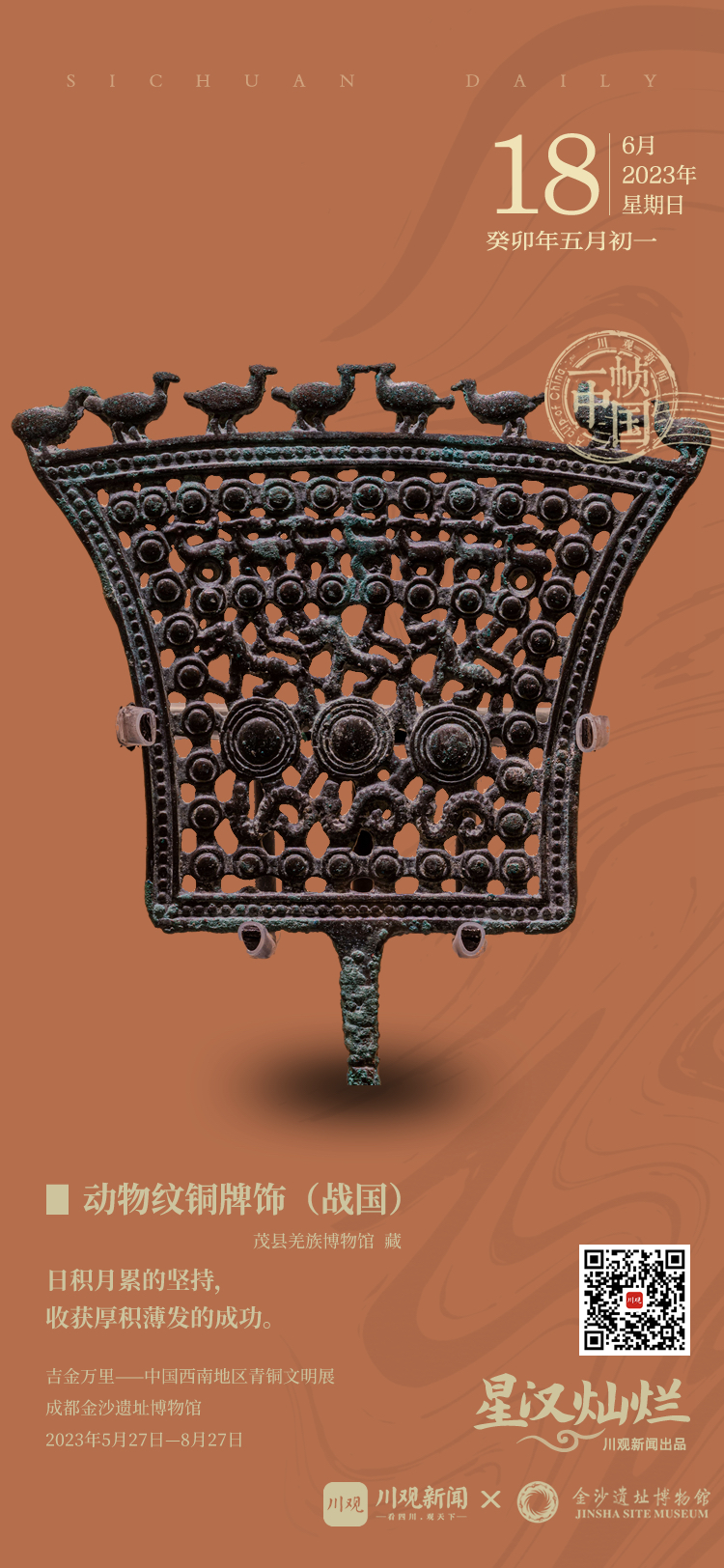 动物纹铜牌饰1992年出土于四川阿坝茂县牟托大墓,是战国时期的文物。铜牌饰的平面形状为带柄扇形,柄部细短,断面近圆形,据推测应当是插在某种器物上的饰件。牌饰外圈饰一圈小乳钉纹,顶上铸有8只相对而立的圆雕禽鸟。牌饰内以同心圆泡区隔三层,间铸动物造型,从上至下依次为鹿、虎、蛇。铜牌饰通高13.5厘米,宽12.7厘米。
