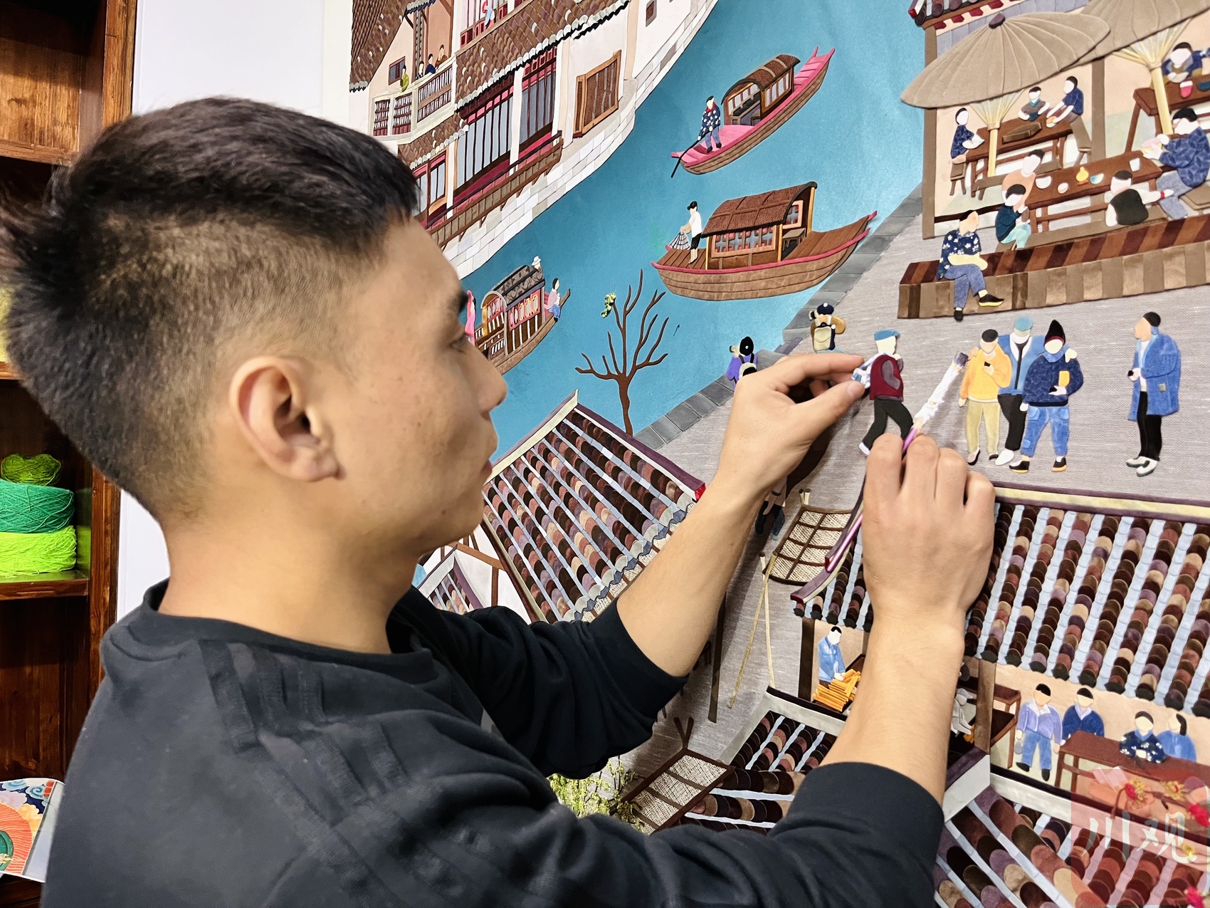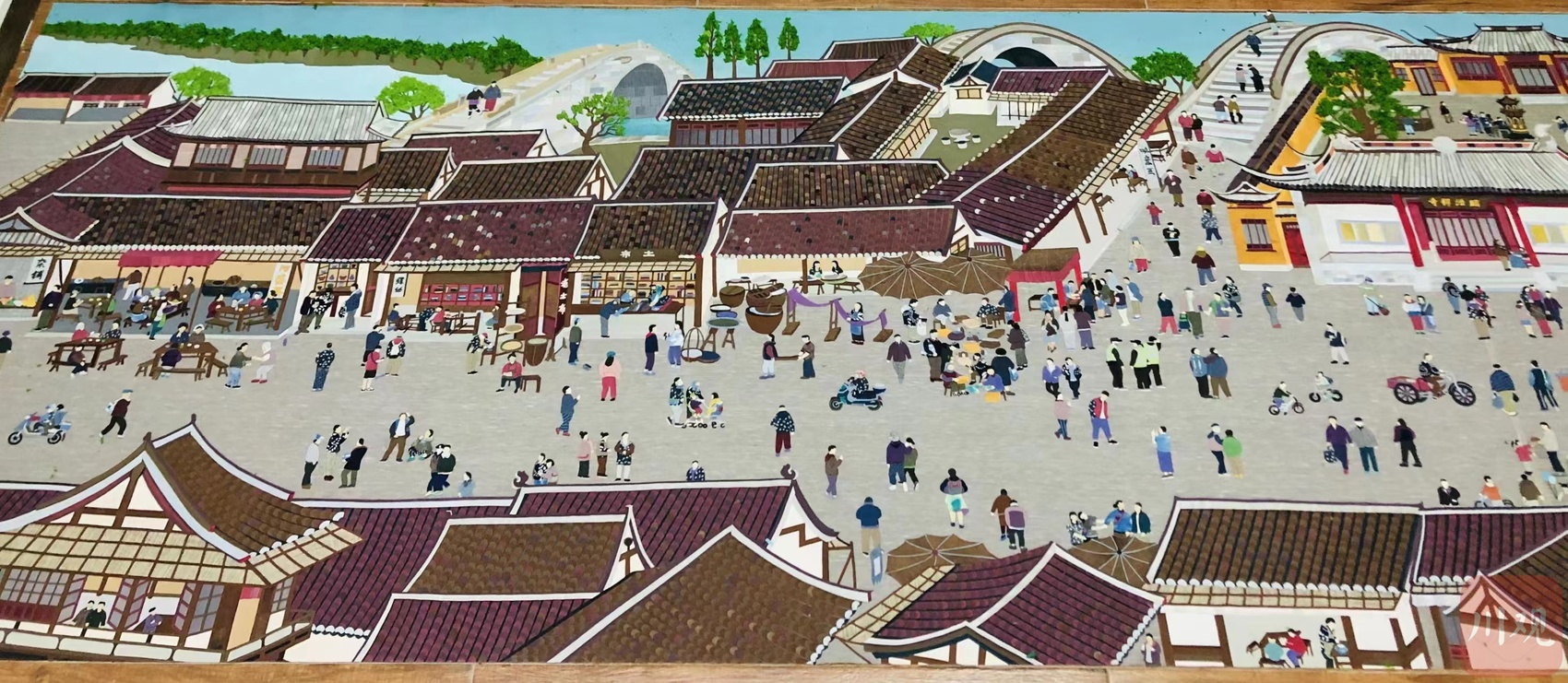 这两幅作品有何特别?俄基连忙拿出手机,打开相册介绍,“杨里罗尔吾我们9个共做了两幅《金泽上河图》。”俄基不由自主地扬起了嘴角,她说,“我们几个和上海的金泽工艺社社长梅冰巧沟通交流后,以壤塘非遗传习所上海基地所在的金泽古镇为原型,《清明上河图》为灵感,创作了这两幅作品。”