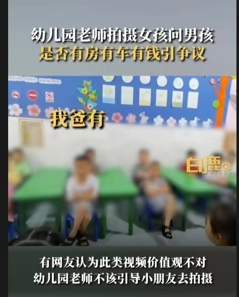 6月18日,有家长在社交平台发布视频,质疑四川遂宁某幼儿园老师所拍视频在教育导向上有问题——让班上女孩集体问男孩是否有房有车有钱。
