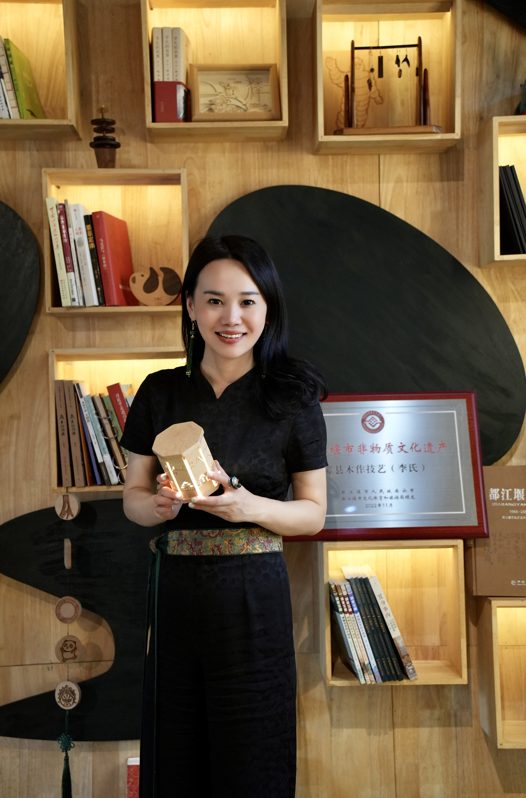 李亚梅,非遗代表性项目灌县木作技艺(李氏)都江堰市级代表性传承人,都江堰木子尹工坊创始人,四川省知识产权发展研究中心原创认证保护宣传大使,成都大运会“市民推广大使”。