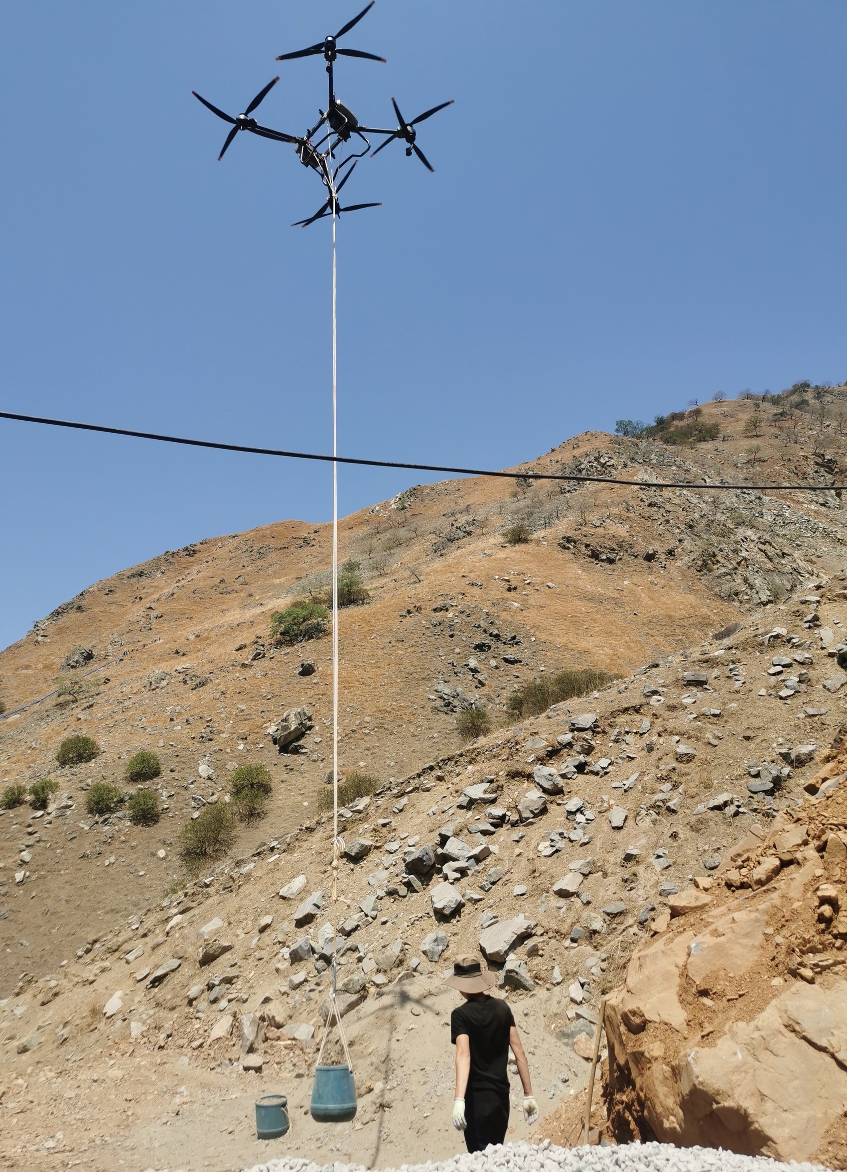 无人机“帮忙” 数百斤重钢管攀上陡坡
