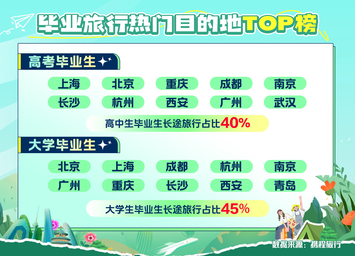 毕业生爱去哪里旅游?数据显示,高中毕业生在6至8月最爱去上海、北京、重庆、成都、南京、长沙、杭州、西安、广州、武汉旅游。而大学毕业生最喜欢去北京、上海、成都、杭州、南京、广州、重庆、长沙、西安和青岛。
