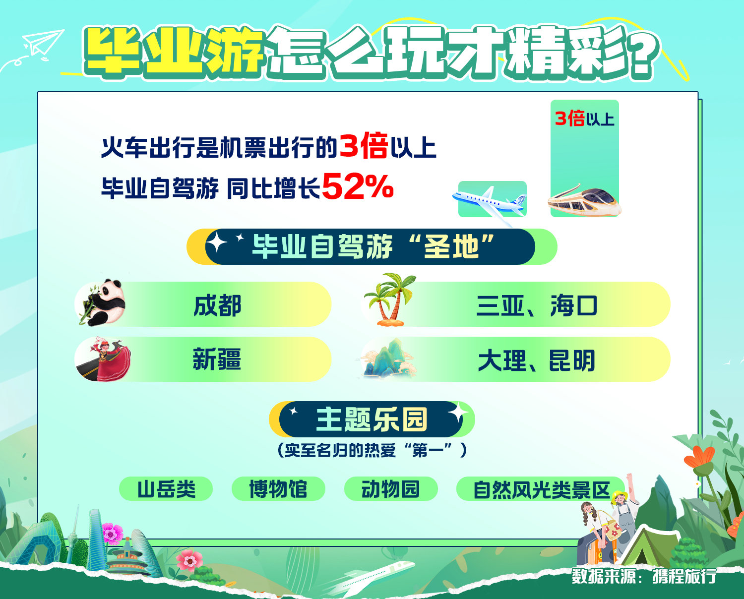与此同时,毕业季的到来也让国内长途旅行迎来高峰期。携程数据发现,高考毕业生预订长途旅游的比例为40%。从出行方式来看,通过高铁动车毕业游的订单远远多于乘飞机出游,毕业生们选择火车出行的订单量是机票单量的3倍以上。