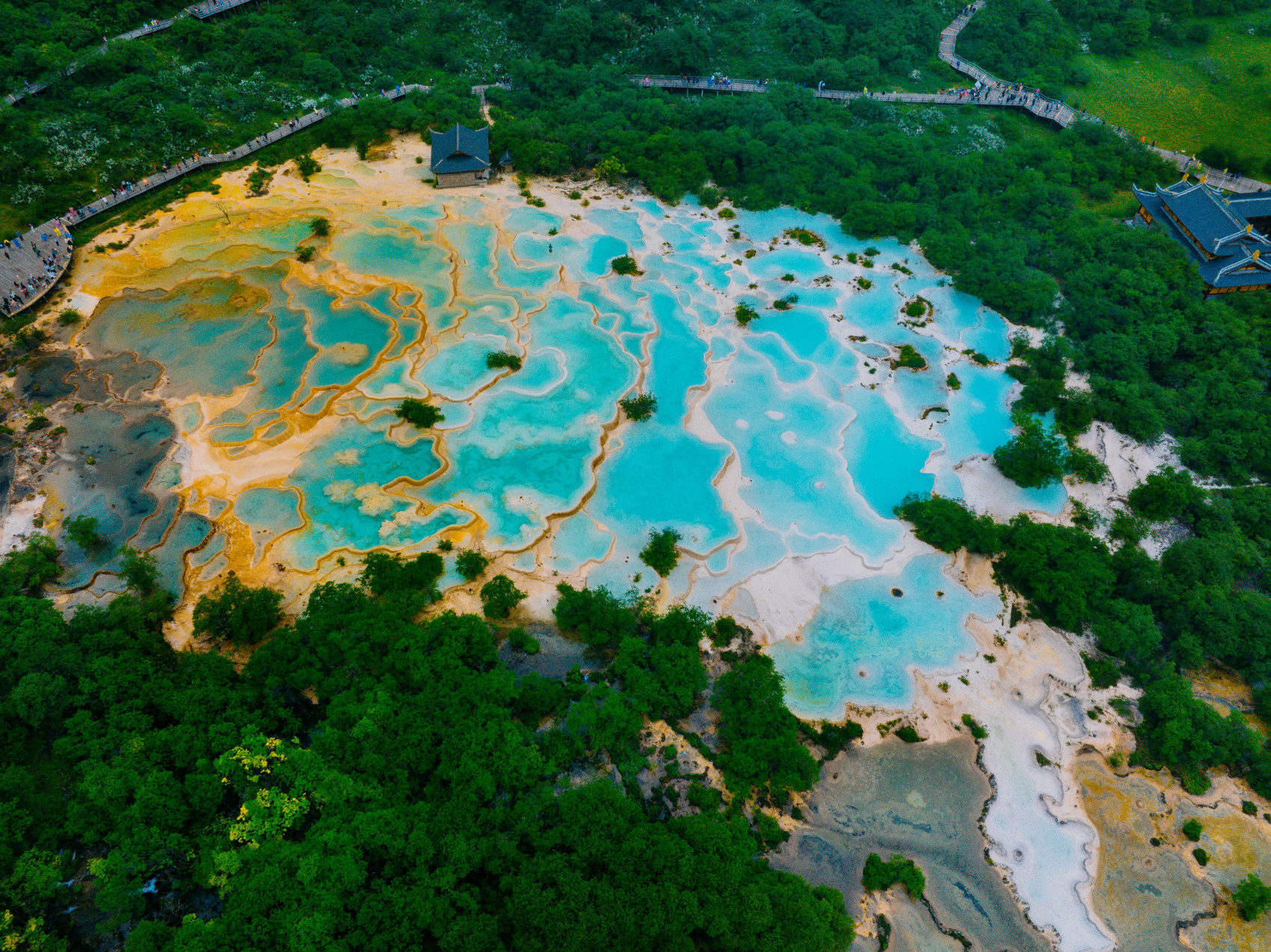 黄龙景区以“彩池、雪山、峡谷、森林、滩流、古寺、民俗”等七绝而闻名。巍峨壮观的雪宝顶,既是黄龙的水塔,也是黄龙神话、传说的载体。一条峡谷黄龙沟,汇聚了森林、彩池、滩流、古寺,3000多个彩池个个风姿绰约。