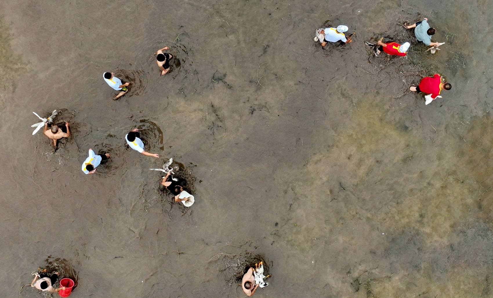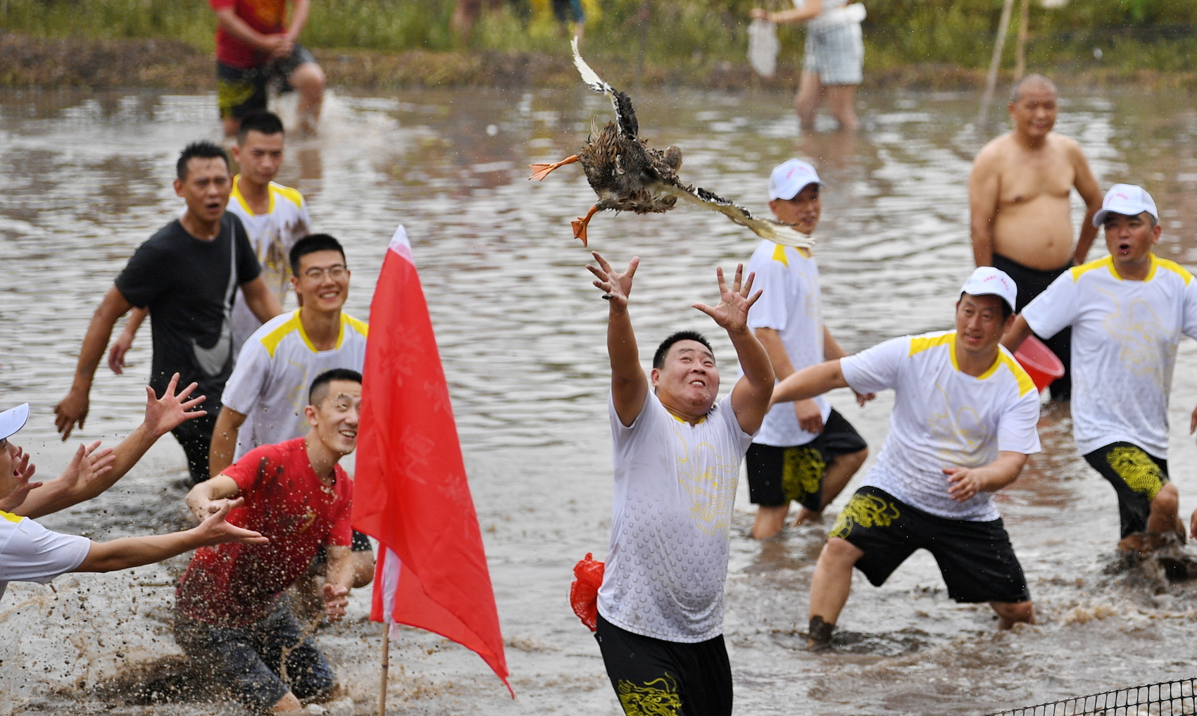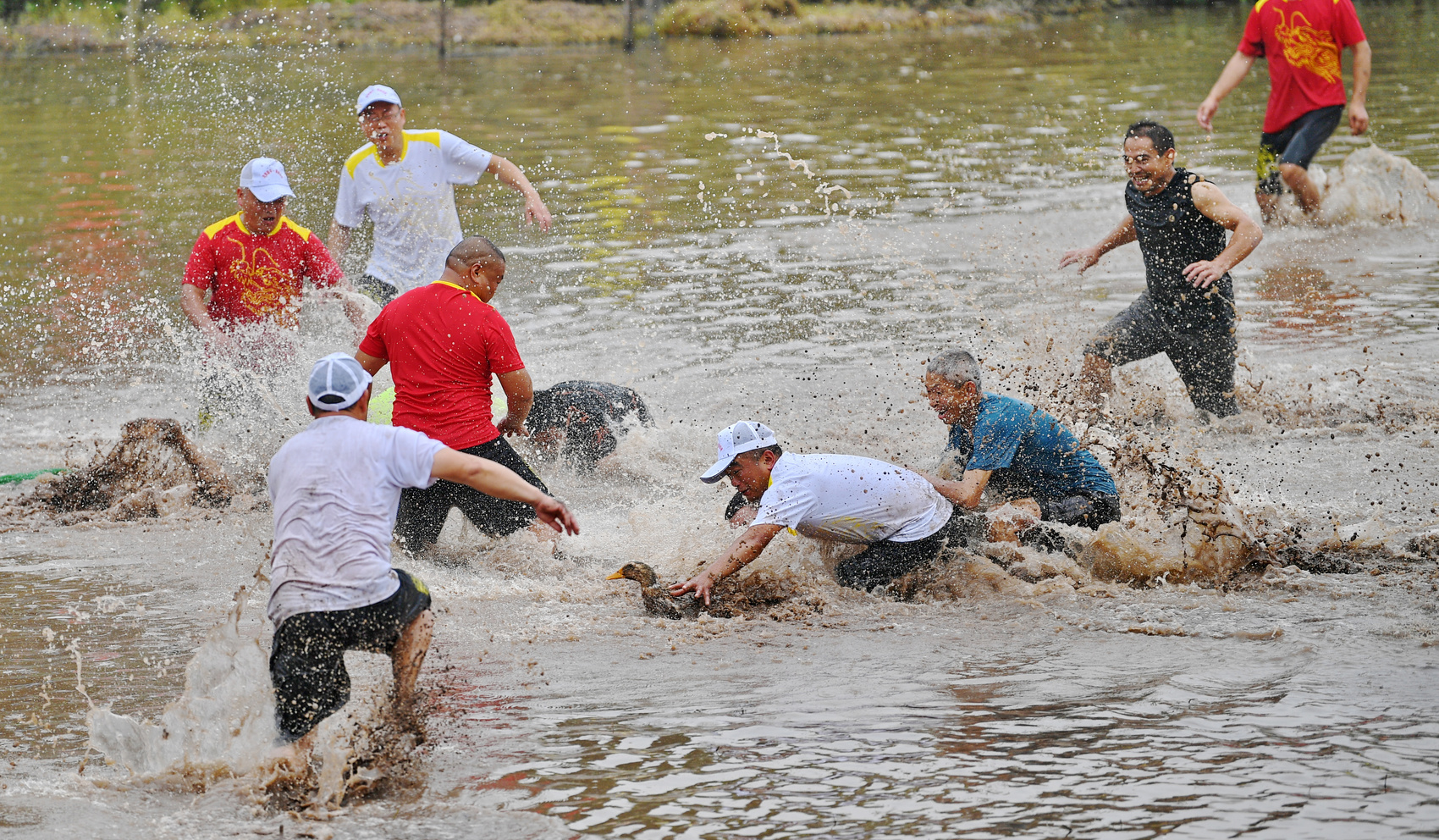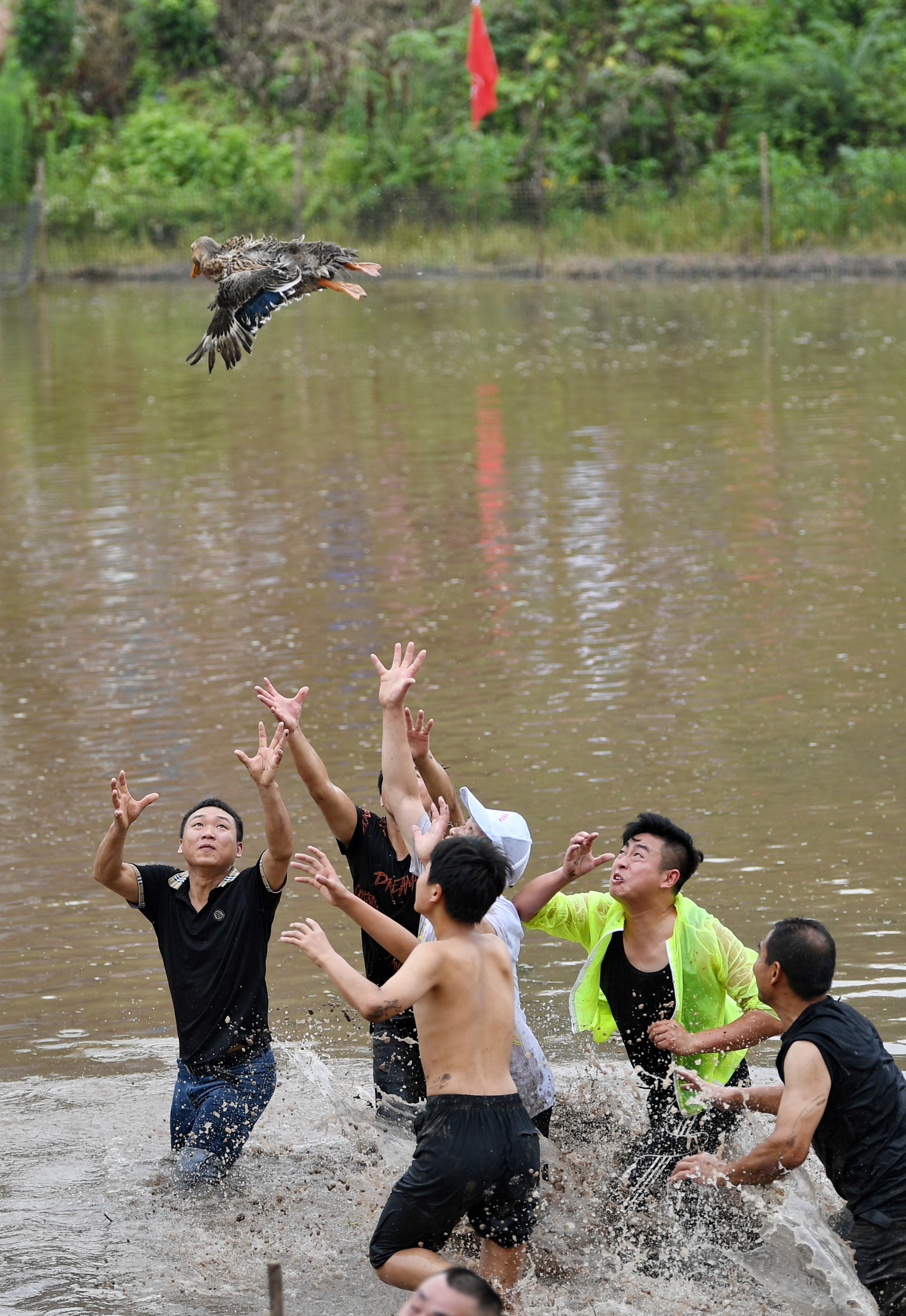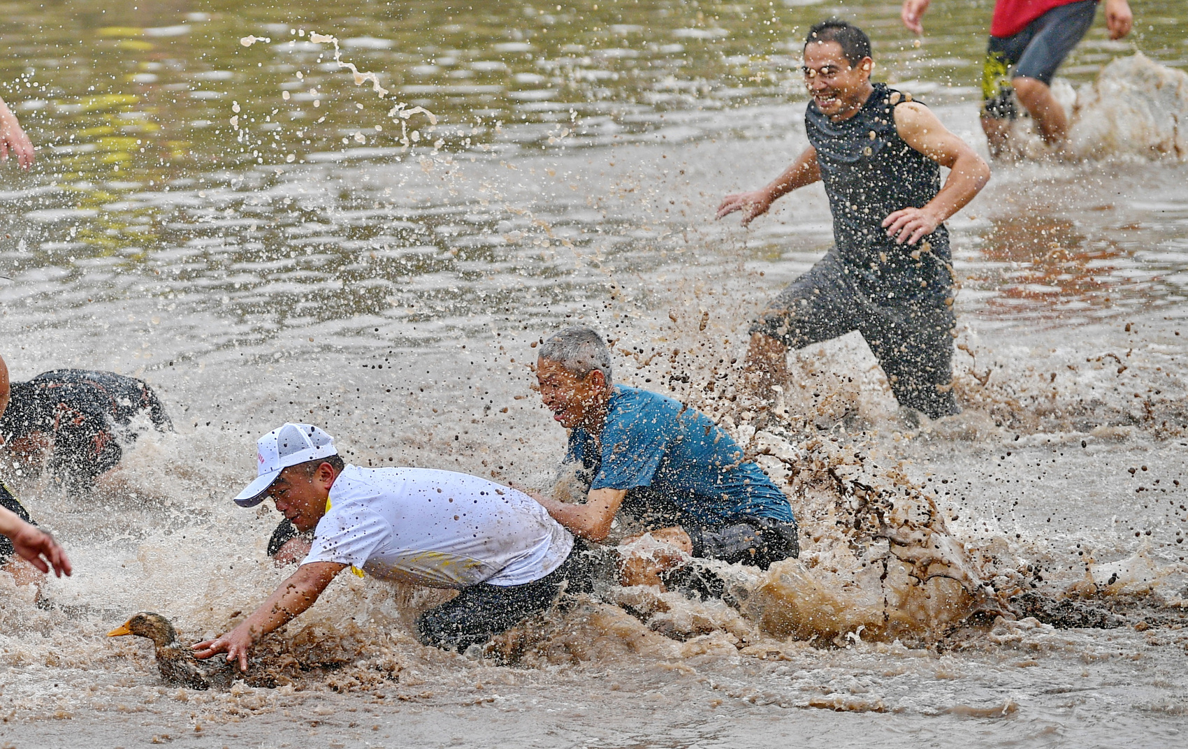 2023年6月20日,在四川省南充市顺庆区双桥镇龙岭村,当地村民正在举行趣味抢鸭子比赛。