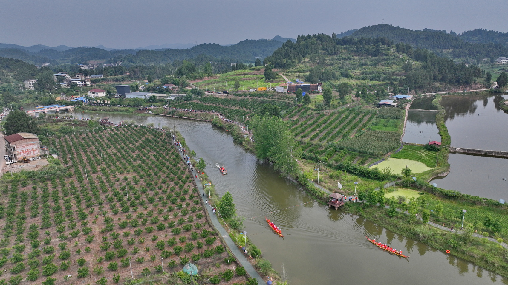 2023年6月20日,在四川省南充市顺庆区双桥镇龙岭村,当地村民正在举行划龙舟比赛。